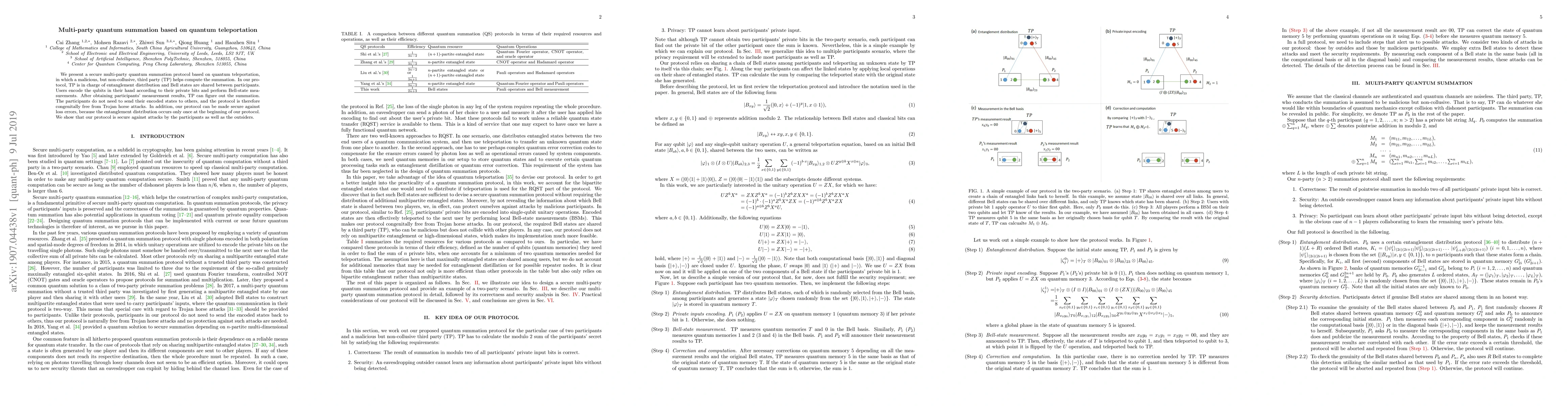 This paper proposes a secure multi-party quantum summation protocol using quantum teleportation, where a non-collusive third party assists in computation without direct state sharing, thus avoiding Trojan horse attacks. The protocol ensures security against loss errors and participant/outsider attacks.