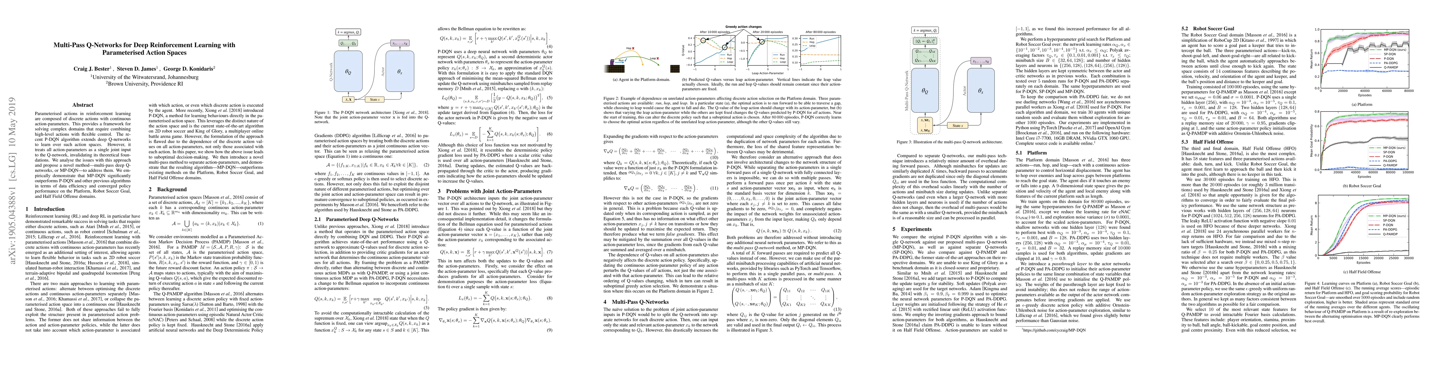 The paper proposes multi-pass deep Q-networks (MP-DQN) to address the limitations of P-DQN in handling parameterized action spaces, demonstrating superior data efficiency and policy performance in complex domains. MP-DQN outperforms previous algorithms in domains like Robot Soccer Goal and Half Field Offense.