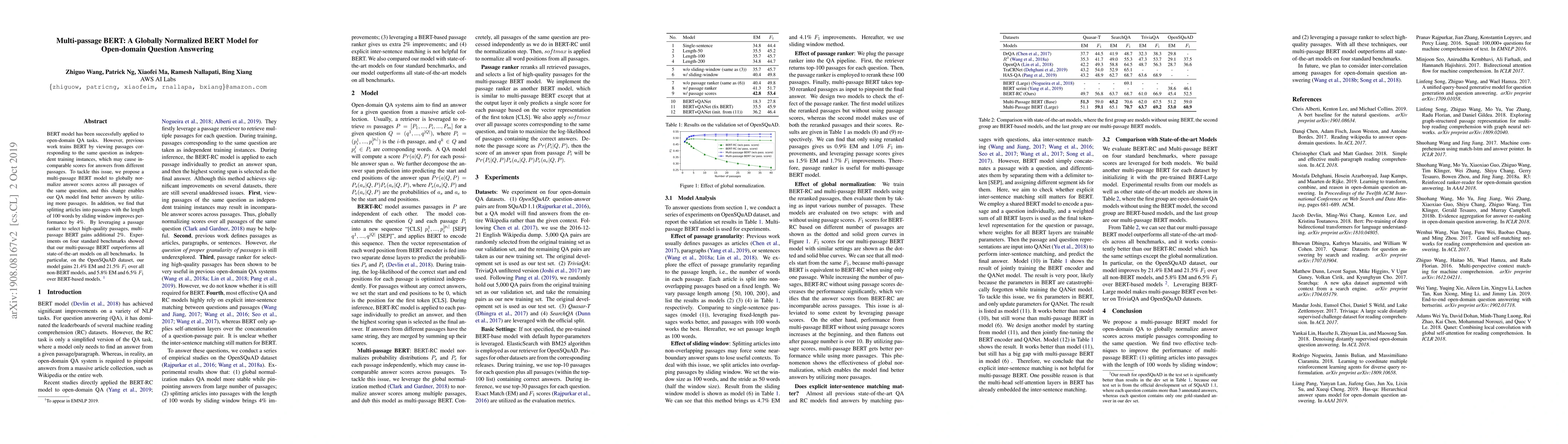 The research introduces Multi-passage BERT, a globally normalized BERT model for open-domain question answering. By globally normalizing answer scores across all passages of the same question, it outperforms previous models, improving performance by 4% with 100-word passage segmentation and an additional 2% using a passage ranker. The model significantly surpasses all state-of-the-art models on four benchmarks, achieving 21.4% EM and 21.5% F1 on OpenSQuAD, surpassing all non-BERT and BERT-based models.