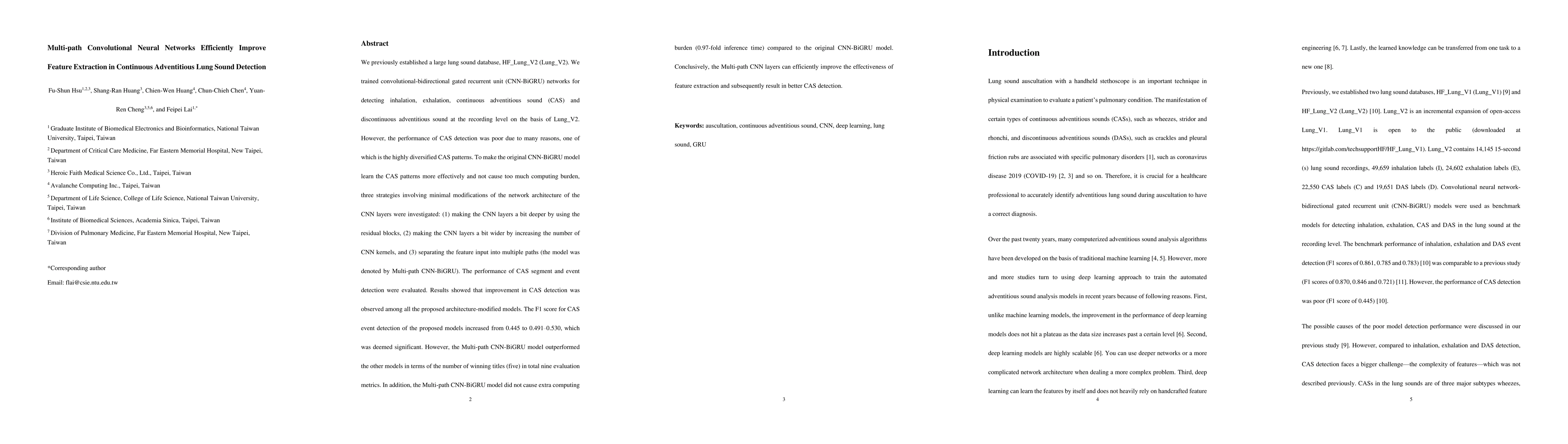 A new model called Multi-path CNN-BiGRU improved feature extraction for continuous adventitious lung sound detection with a 0.97-fold reduction in computing burden, outperforming other models in nine evaluation metrics.
