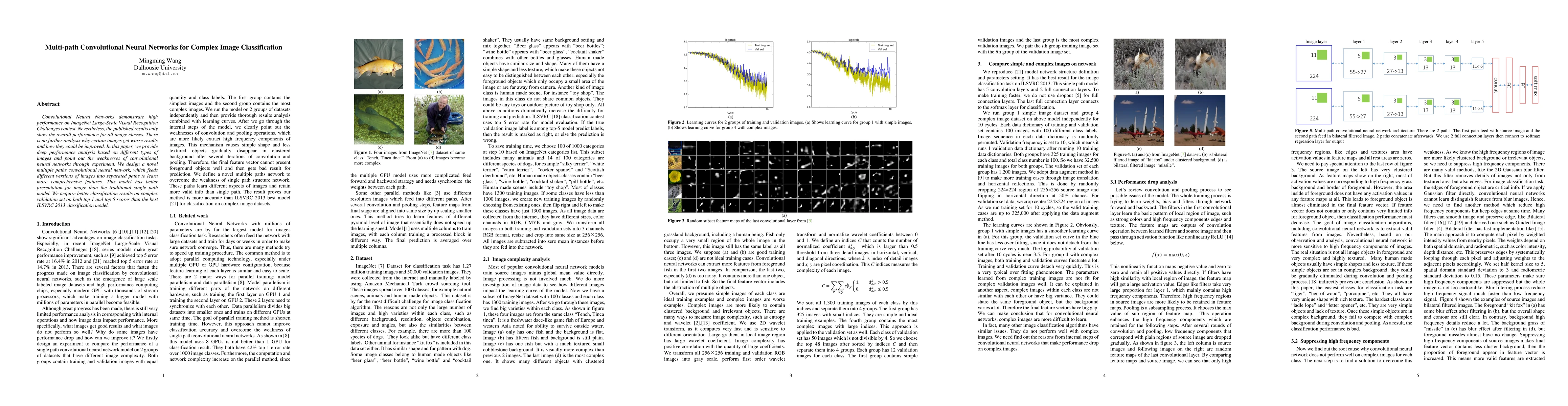 Convolutional Neural Networks demonstrate high performance on ImageNet Large-Scale Visual Recognition Challenges contest. Nevertheless, the published results only show the overall performance for all image classes. There is no further analysis why certain images get worse results and how they could be improved. In this paper, we provide deep performance analysis based on different types of images and point out the weaknesses of convolutional neural networks through experiment. We design a novel multiple paths convolutional neural network, which feeds different versions of images into separated paths to learn more comprehensive features. This model has better presentation for image than the traditional single path model. We acquire better classification results on complex validation set on both top 1 and top 5 scores than the best ILSVRC 2013 classification model.