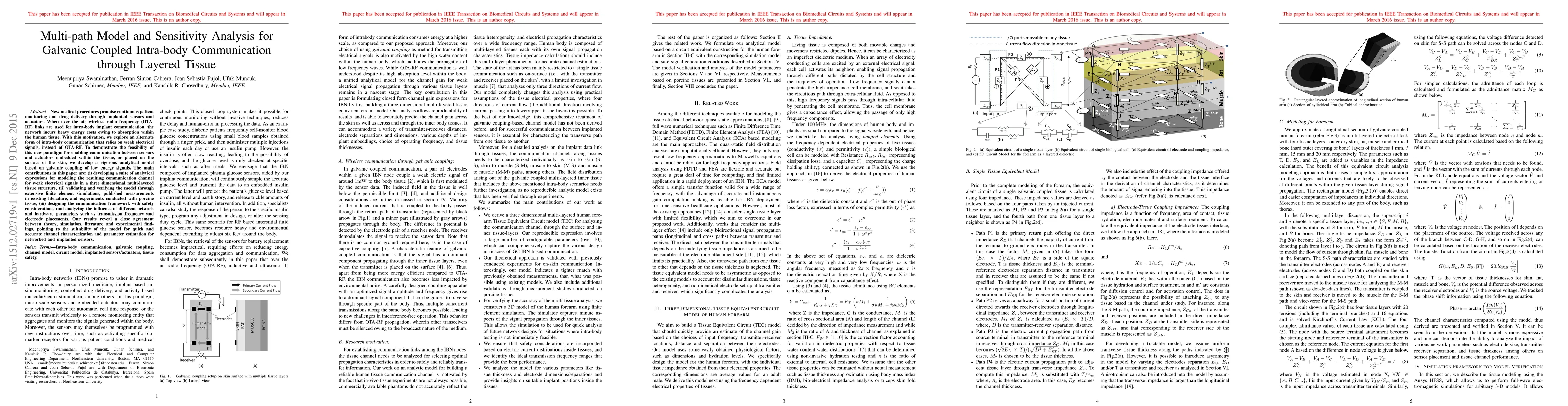 This paper develops a multi-path model for galvanic coupled intra-body communication through layered tissue, demonstrating its feasibility via analytical expressions, simulations, and experiments. The model shows strong agreement between theoretical and empirical results, highlighting its potential for accurate channel characterization in networked medical implants.
