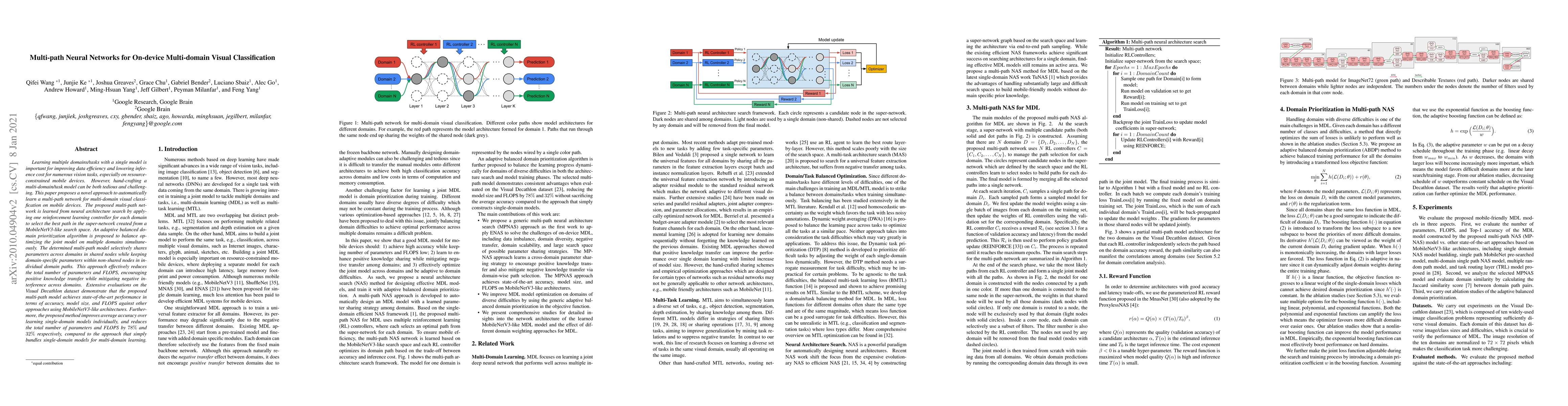 Learning multiple domains/tasks with a single model is important for improving data efficiency and lowering inference cost for numerous vision tasks, especially on resource-constrained mobile devices. However, hand-crafting a multi-domain/task model can be both tedious and challenging. This paper proposes a novel approach to automatically learn a multi-path network for multi-domain visual classification on mobile devices. The proposed multi-path network is learned from neural architecture search by applying one reinforcement learning controller for each domain to select the best path in the super-network created from a MobileNetV3-like search space. An adaptive balanced domain prioritization algorithm is proposed to balance optimizing the joint model on multiple domains simultaneously. The determined multi-path model selectively shares parameters across domains in shared nodes while keeping domain-specific parameters within non-shared nodes in individual domain paths. This approach effectively reduces the total number of parameters and FLOPS, encouraging positive knowledge transfer while mitigating negative interference across domains. Extensive evaluations on the Visual Decathlon dataset demonstrate that the proposed multi-path model achieves state-of-the-art performance in terms of accuracy, model size, and FLOPS against other approaches using MobileNetV3-like architectures. Furthermore, the proposed method improves average accuracy over learning single-domain models individually, and reduces the total number of parameters and FLOPS by 78% and 32% respectively, compared to the approach that simply bundles single-domain models for multi-domain learning.