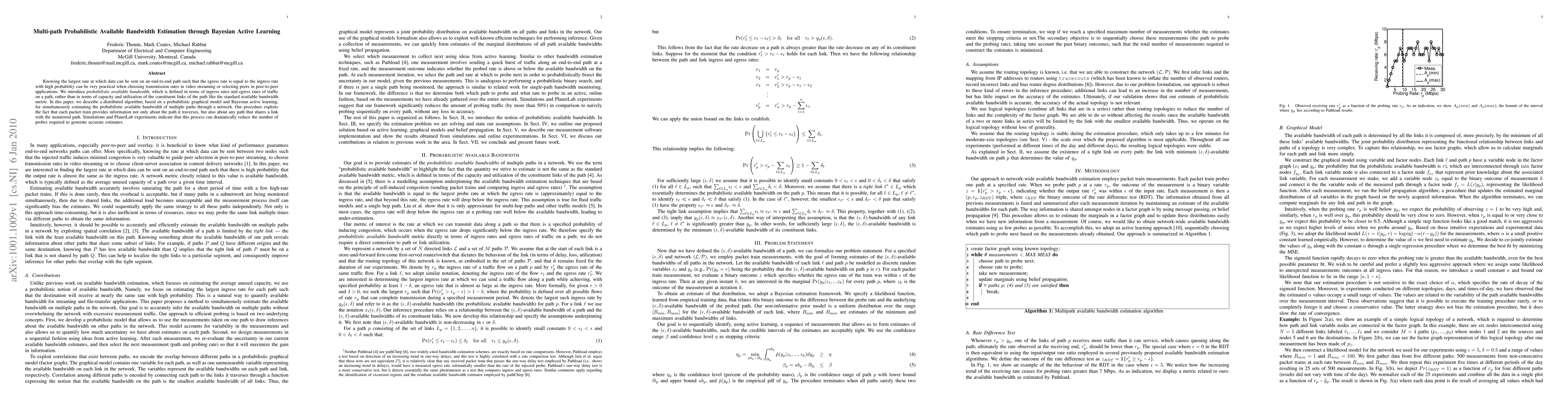 This paper proposes a Bayesian active learning algorithm for estimating probabilistic available bandwidth across multiple paths in a network, focusing on the rates of ingress and egress traffic rather than link capacities. The method significantly reduces the number of probes needed to achieve accurate estimates, as demonstrated by simulations and PlanetLab experiments.