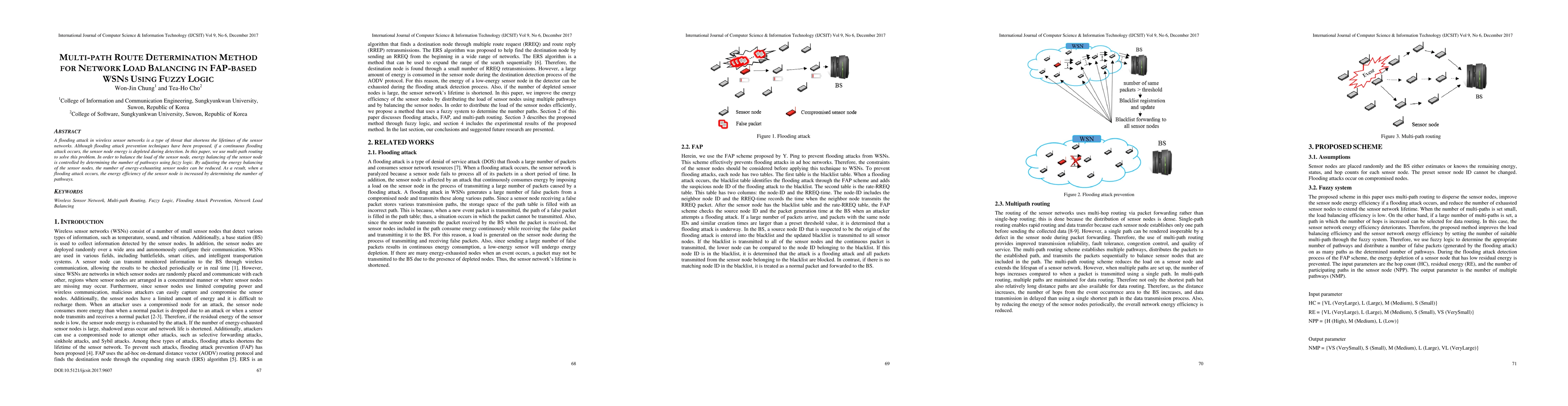 This paper proposes a multi-path routing method using fuzzy logic to balance network load in FAP-based WSNs, aiming to mitigate the energy depletion caused by flooding attacks. By dynamically adjusting the number of pathways, it enhances energy efficiency and prolongs the network's lifetime during attacks.