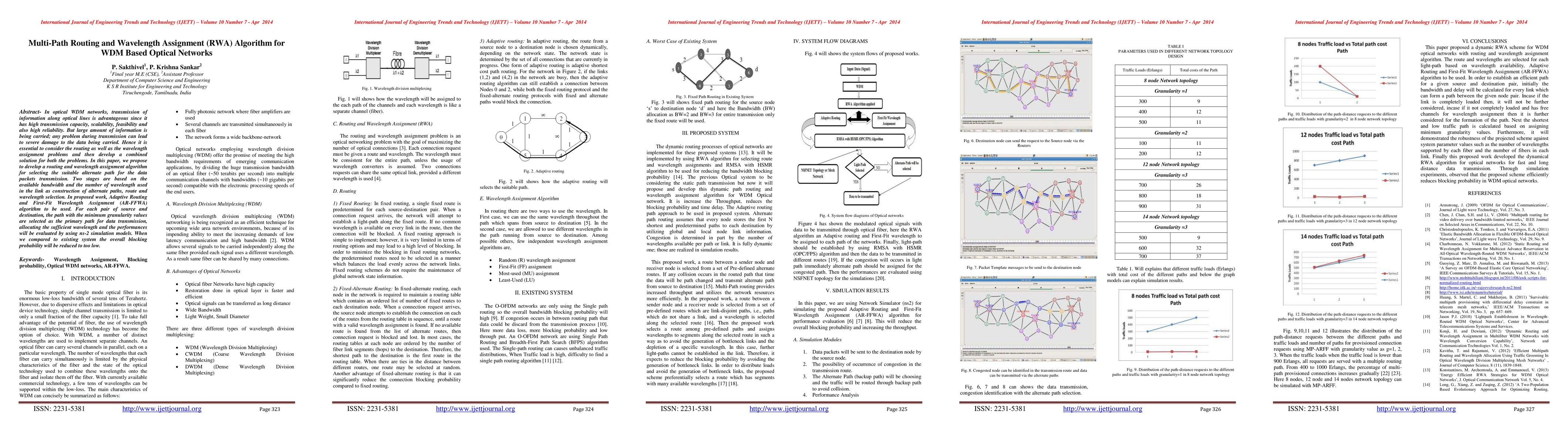 This paper proposes an Adaptive Routing and First-Fit Wavelength Assignment (AR-FFWA) algorithm for multi-path routing and wavelength assignment in WDM optical networks. The algorithm aims to minimize blocking probability by selecting optimal alternate paths and wavelengths, evaluated through ns-2 simulations, showing significant improvement over existing systems.