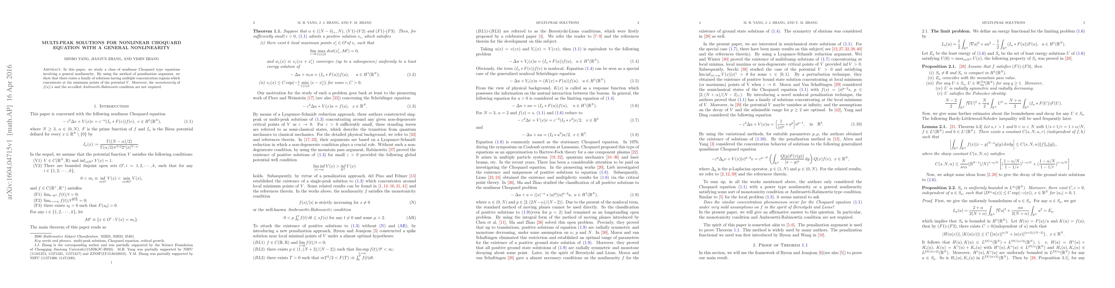 Summary: This paper investigates nonlinear Choquard equations with a general nonlinearity, demonstrating the existence of multi-peak solutions using the penalization method, without requiring monotonicity or the Ambrosetti-Rabinowitz condition. Solutions concentrate at potential's minimum points.