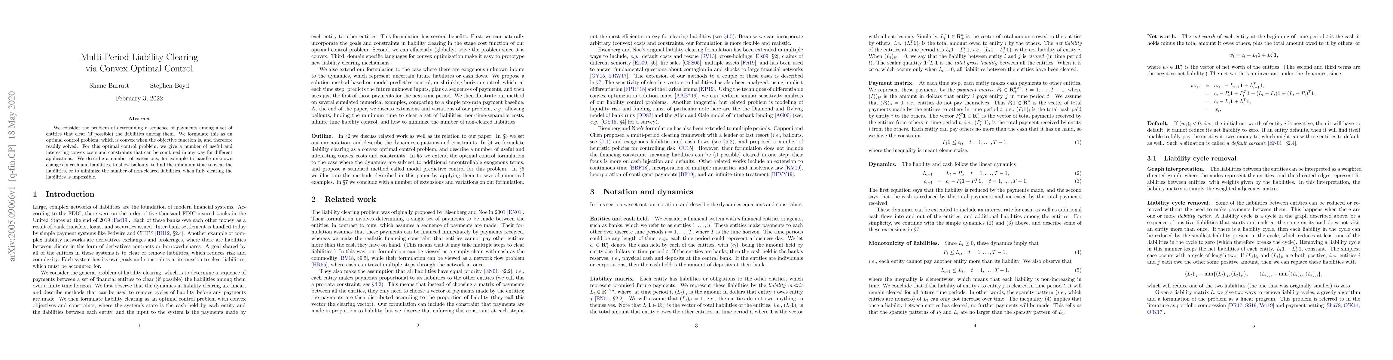 We consider the problem of determining a sequence of payments among a set of entities that clear (if possible) the liabilities among them. We formulate this as an optimal control problem, which is convex when the objective function is, and therefore readily solved. For this optimal control problem, we give a number of useful and interesting convex costs and constraints that can be combined in any way for different applications. We describe a number of extensions, for example to handle unknown changes in cash and liabilities, to allow bailouts, to find the minimum time to clear the liabilities, or to minimize the number of non-cleared liabilities, when fully clearing the liabilities is impossible.