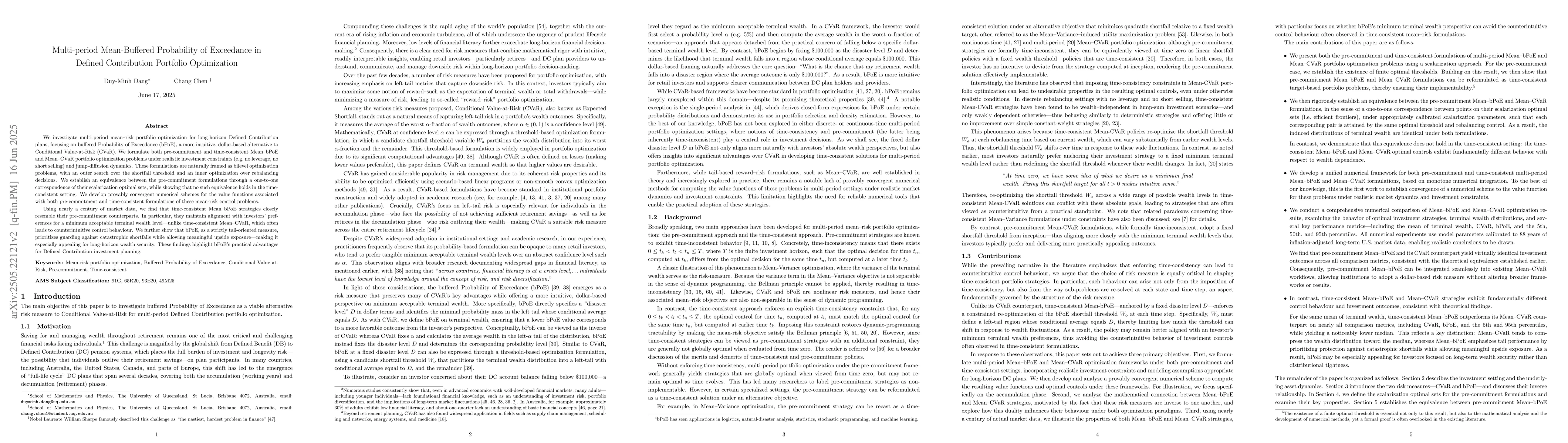 This work differentiates itself by focusing on Buffered Probability of Exceedance (bPoE) as a tail-oriented measure for long-horizon wealth security, contrasting it with the commonly used Conditional Value-at-Risk (CVaR) in Defined Contribution portfolio optimization.