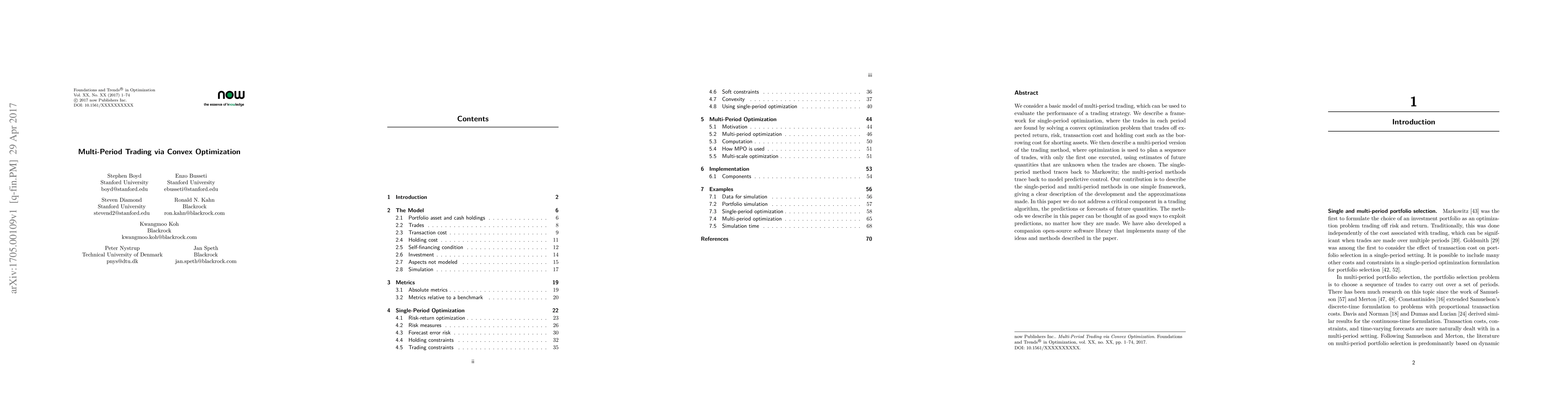 We consider a basic model of multi-period trading, which can be used to evaluate the performance of a trading strategy. We describe a framework for single-period optimization, where the trades in each period are found by solving a convex optimization problem that trades off expected return, risk, transaction cost and holding cost such as the borrowing cost for shorting assets. We then describe a multi-period version of the trading method, where optimization is used to plan a sequence of trades, with only the first one executed, using estimates of future quantities that are unknown when the trades are chosen. The single-period method traces back to Markowitz; the multi-period methods trace back to model predictive control. Our contribution is to describe the single-period and multi-period methods in one simple framework, giving a clear description of the development and the approximations made. In this paper we do not address a critical component in a trading algorithm, the predictions or forecasts of future quantities. The methods we describe in this paper can be thought of as good ways to exploit predictions, no matter how they are made. We have also developed a companion open-source software library that implements many of the ideas and methods described in the paper.