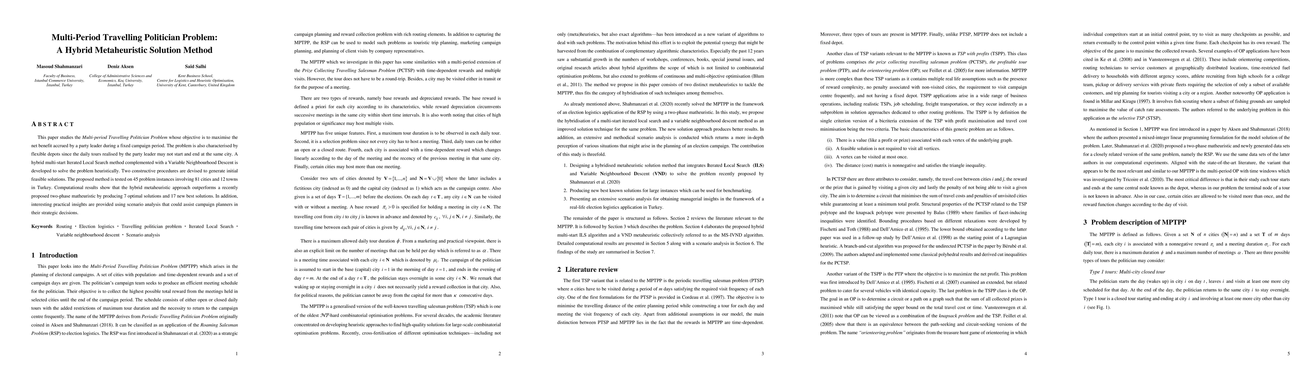 This paper proposes a hybrid metaheuristic combining multi-start Iterated Local Search and Variable Neighbourhood Descent to solve the Multi-period Travelling Politician Problem, which aims to maximize net benefit for a party leader. The method outperforms a previous two-phase matheuristic, generating optimal and new best solutions for 45 instances involving 81 cities and 12 towns in Turkey.