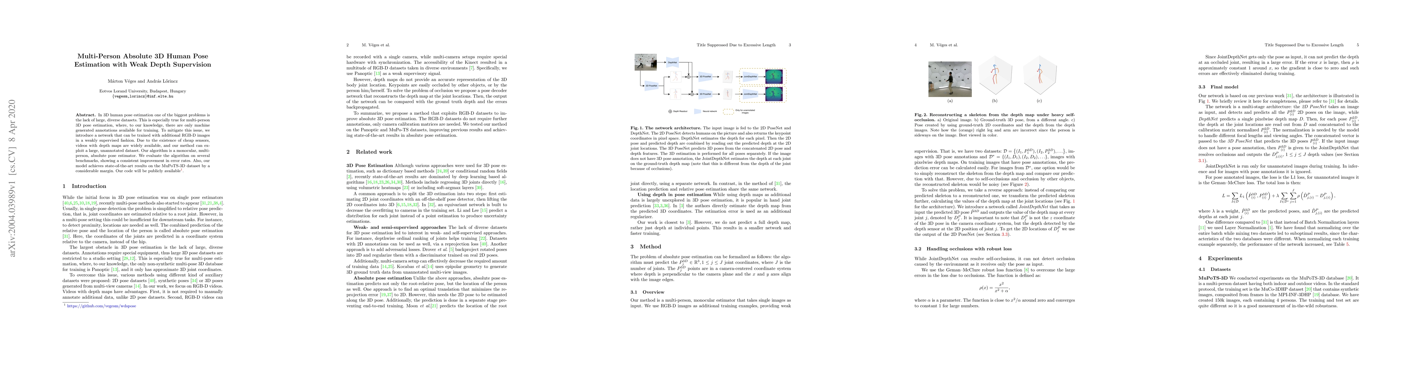 This paper proposes a novel network for multi-person 3D human pose estimation that leverages weakly supervised RGB-D images, addressing the scarcity of large, diverse datasets. The method achieves state-of-the-art results on the MuPoTS-3D dataset and demonstrates consistent improvements in error rates across benchmarks.