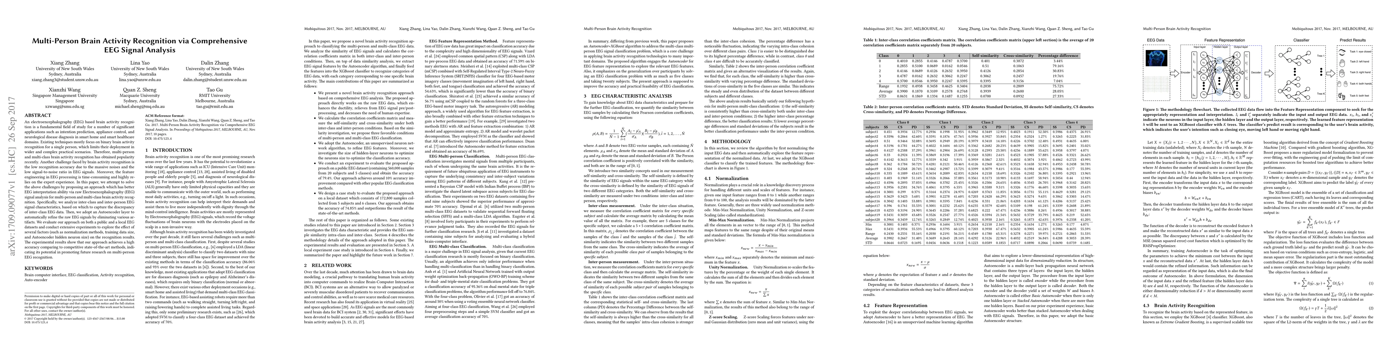 This paper proposes a novel approach for multi-person and multi-class brain activity recognition using comprehensive EEG signal analysis, addressing challenges like low recognition accuracy and the complexity of feature engineering. The approach refines raw EEG signals with an Autoencoder to eliminate artifacts, achieving higher recognition accuracy compared to existing methods.