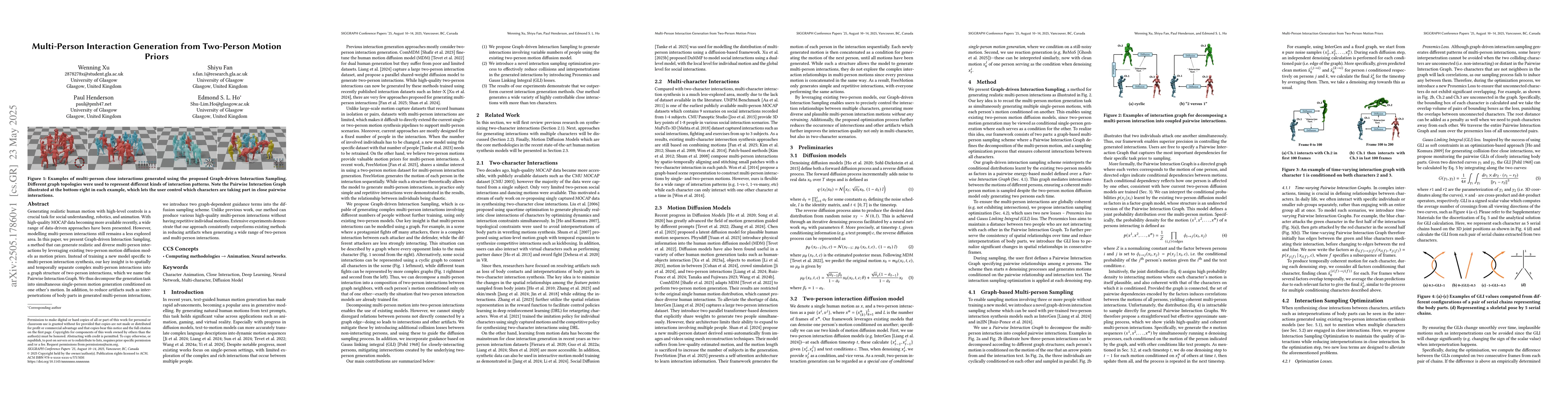 This work stands out by proposing a novel approach that separates multi-person interactions into a graph of two-person interactions, rather than training a new model specifically for multi-person synthesis, thus enabling the generation of diverse and realistic interactions with fewer repetitive motions.