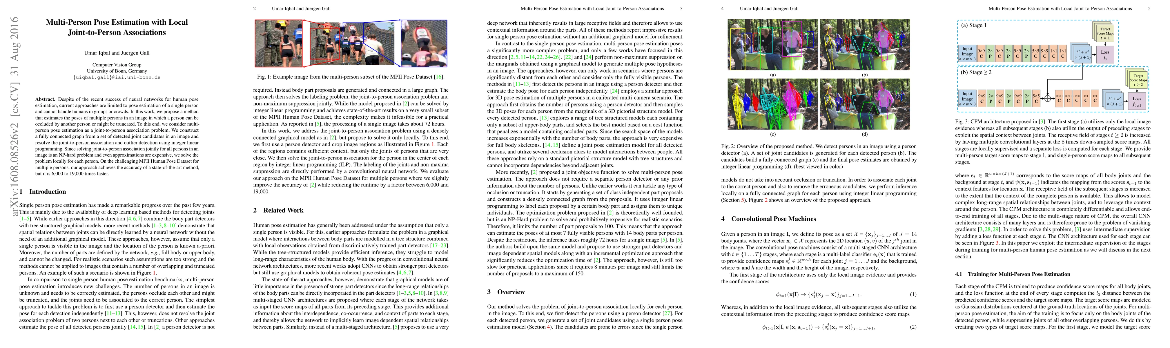 This paper proposes a method for multi-person pose estimation by treating joint-to-person association as an integer linear programming problem, solved locally for each person to improve efficiency. The approach achieves state-of-the-art accuracy on the MPII Human Pose Dataset while being significantly faster.