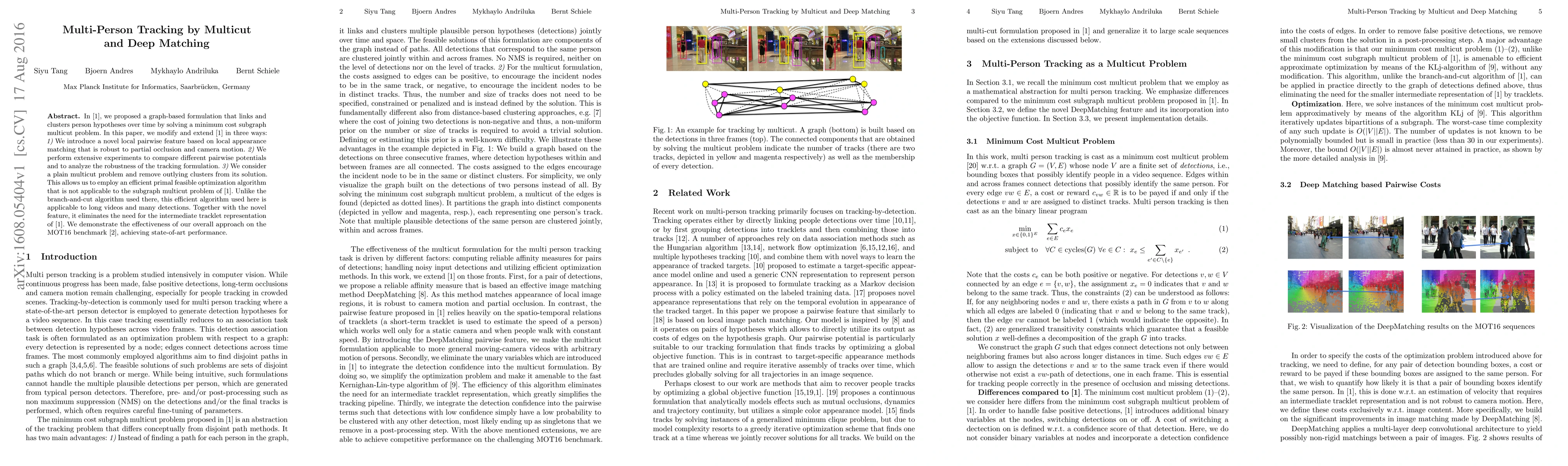In [1], we proposed a graph-based formulation that links and clusters person hypotheses over time by solving a minimum cost subgraph multicut problem. In this paper, we modify and extend [1] in three ways: 1) We introduce a novel local pairwise feature based on local appearance matching that is robust to partial occlusion and camera motion. 2) We perform extensive experiments to compare different pairwise potentials and to analyze the robustness of the tracking formulation. 3) We consider a plain multicut problem and remove outlying clusters from its solution. This allows us to employ an efficient primal feasible optimization algorithm that is not applicable to the subgraph multicut problem of [1]. Unlike the branch-and-cut algorithm used there, this efficient algorithm used here is applicable to long videos and many detections. Together with the novel feature, it eliminates the need for the intermediate tracklet representation of [1]. We demonstrate the effectiveness of our overall approach on the MOT16 benchmark [2], achieving state-of-art performance.