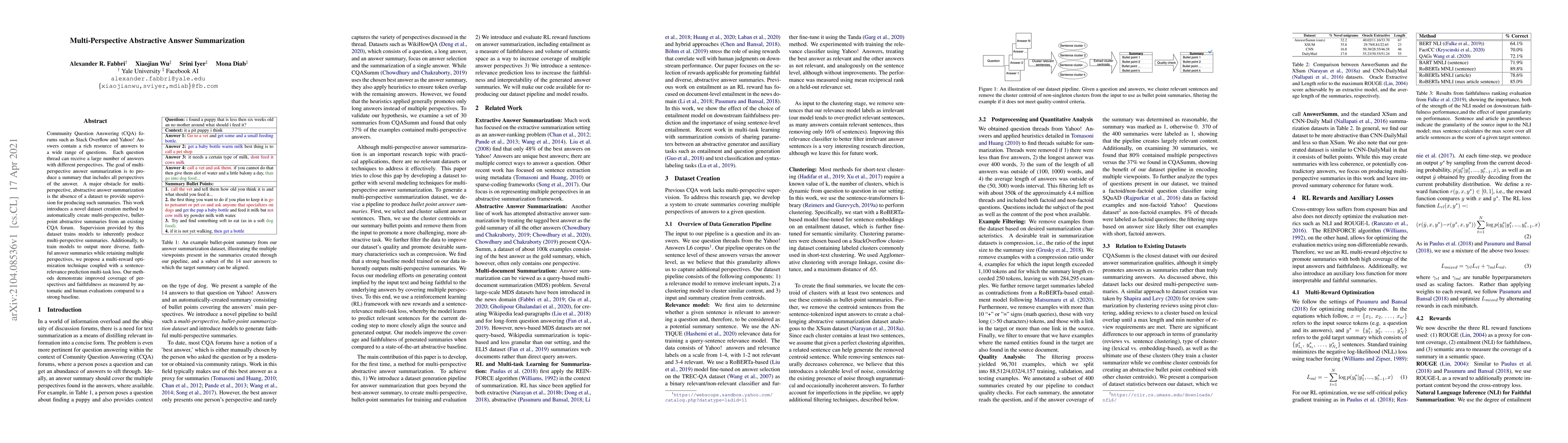 This paper introduces a dataset for creating multi-perspective, abstractive summaries of answers in community question answering forums. It proposes a multi-reward optimization technique and a sentence-relevance prediction multi-task loss to enhance model training, resulting in summaries that better capture diverse perspectives and are more faithful to the original answers.