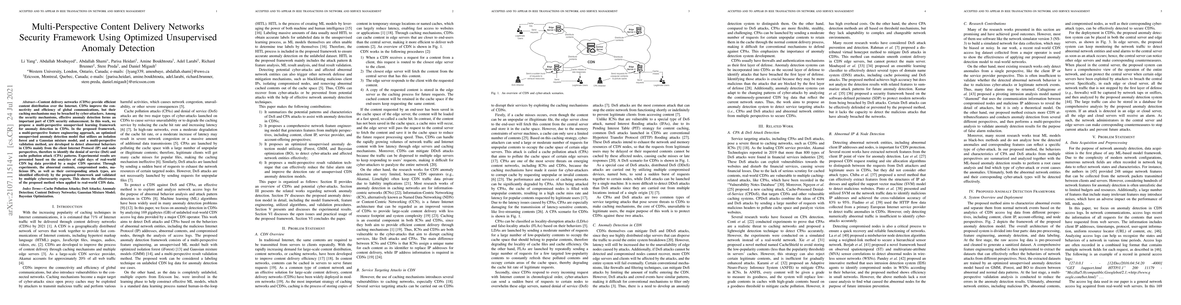 This paper proposes a multi-perspective unsupervised learning framework for anomaly detection in CDNs, utilizing optimized models like isolation forest and Gaussian mixture model to identify DoS and CPA attacks. Experimental results on real-world CDN data demonstrate the framework's effectiveness in detecting abnormal behaviors and attack patterns.