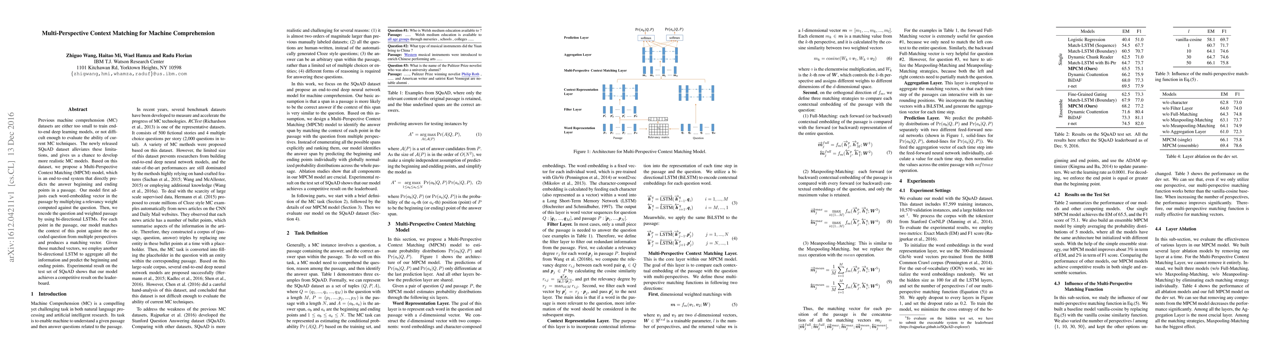 Previous machine comprehension (MC) datasets are either too small to train end-to-end deep learning models, or not difficult enough to evaluate the ability of current MC techniques. The newly released SQuAD dataset alleviates these limitations, and gives us a chance to develop more realistic MC models. Based on this dataset, we propose a Multi-Perspective Context Matching (MPCM) model, which is an end-to-end system that directly predicts the answer beginning and ending points in a passage. Our model first adjusts each word-embedding vector in the passage by multiplying a relevancy weight computed against the question. Then, we encode the question and weighted passage by using bi-directional LSTMs. For each point in the passage, our model matches the context of this point against the encoded question from multiple perspectives and produces a matching vector. Given those matched vectors, we employ another bi-directional LSTM to aggregate all the information and predict the beginning and ending points. Experimental result on the test set of SQuAD shows that our model achieves a competitive result on the leaderboard.