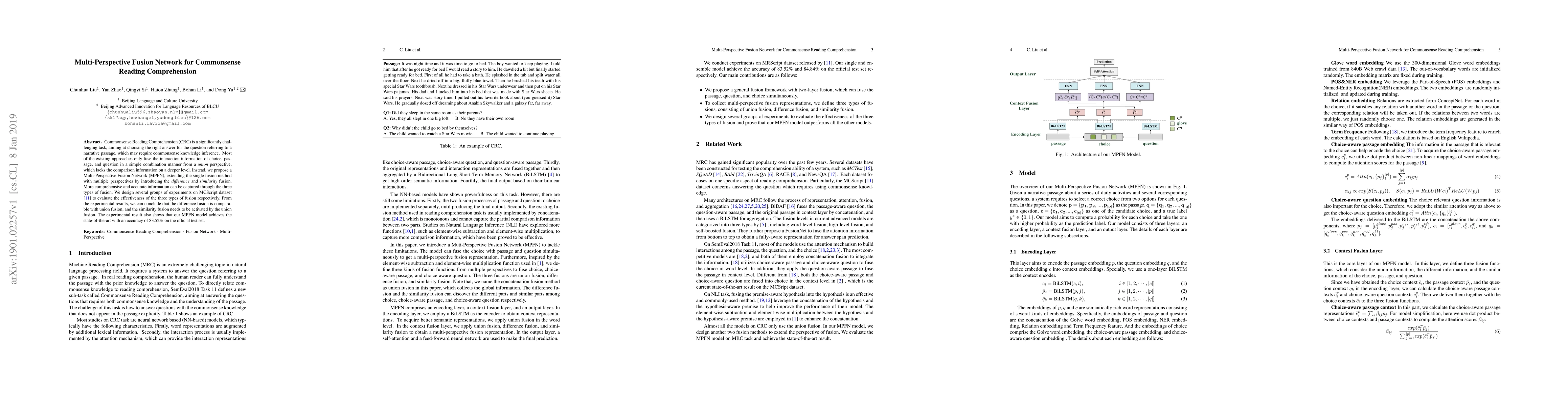 This paper proposes a Multi-Perspective Fusion Network for Commonsense Reading Comprehension, which captures more comprehensive information through three types of fusion: union, difference, and similarity. The model achieves the state-of-the-art accuracy of 83.52% on the official test set.