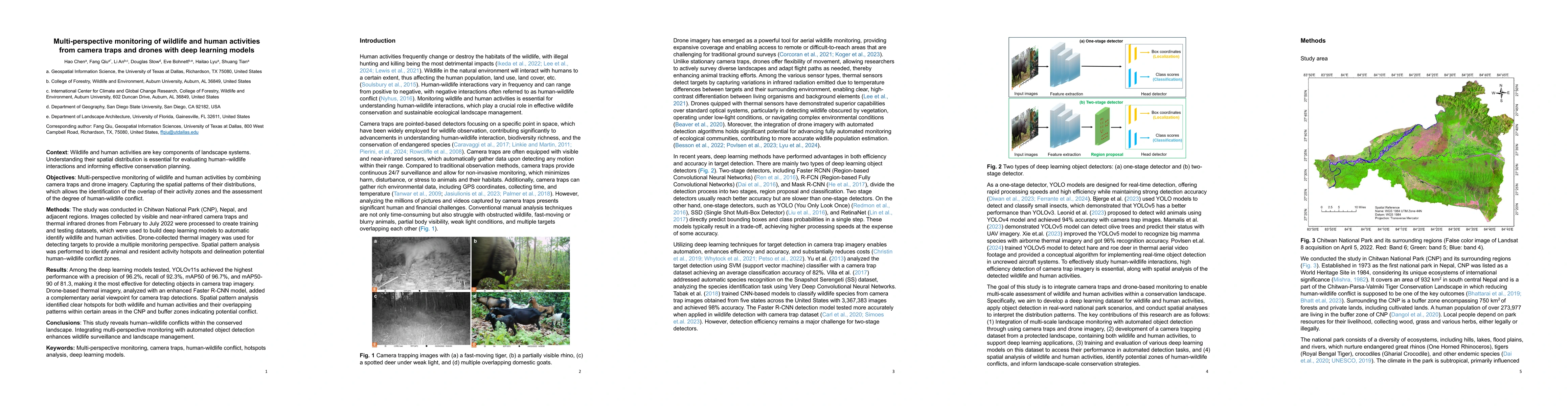 Wildlife and human activities are key components of landscape systems. Understanding their spatial distribution is essential for evaluating human wildlife interactions and informing effective conservation planning. Multiperspective monitoring of wildlife and human activities by combining camera traps and drone imagery. Capturing the spatial patterns of their distributions, which allows the identification of the overlap of their activity zones and the assessment of the degree of human wildlife conflict. The study was conducted in Chitwan National Park (CNP), Nepal, and adjacent regions. Images collected by visible and nearinfrared camera traps and thermal infrared drones from February to July 2022 were processed to create training and testing datasets, which were used to build deep learning models to automatic identify wildlife and human activities. Drone collected thermal imagery was used for detecting targets to provide a multiple monitoring perspective. Spatial pattern analysis was performed to identify animal and resident activity hotspots and delineation potential human wildlife conflict zones. Among the deep learning models tested, YOLOv11s achieved the highest performance with a precision of 96.2%, recall of 92.3%, mAP50 of 96.7%, and mAP50 of 81.3%, making it the most effective for detecting objects in camera trap imagery. Drone based thermal imagery, analyzed with an enhanced Faster RCNN model, added a complementary aerial viewpoint for camera trap detections. Spatial pattern analysis identified clear hotspots for both wildlife and human activities and their overlapping patterns within certain areas in the CNP and buffer zones indicating potential conflict. This study reveals human wildlife conflicts within the conserved landscape. Integrating multiperspective monitoring with automated object detection enhances wildlife surveillance and landscape management.