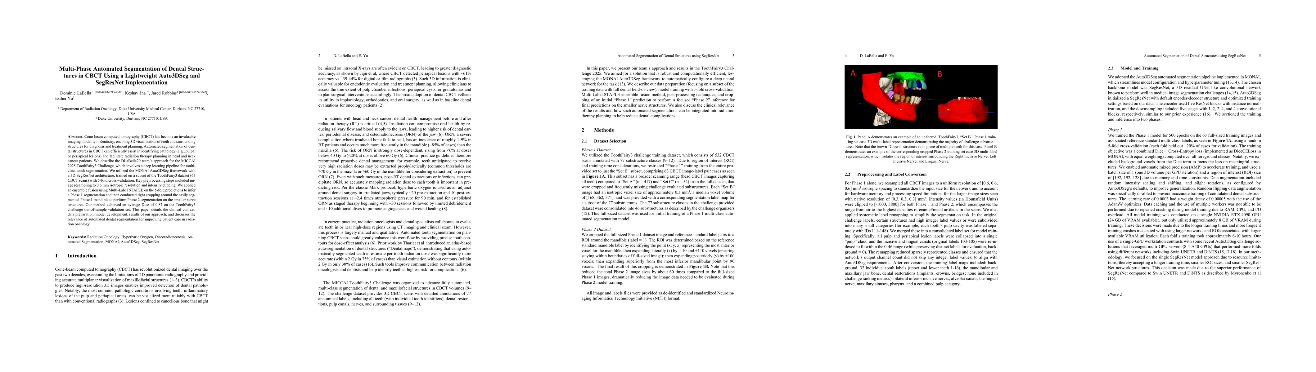Cone-beam computed tomography (CBCT) has become an invaluable imaging modality in dentistry, enabling 3D visualization of teeth and surrounding structures for diagnosis and treatment planning. Automated segmentation of dental structures in CBCT can efficiently assist in identifying pathology (e.g., pulpal or periapical lesions) and facilitate radiation therapy planning in head and neck cancer patients. We describe the DLaBella29 team's approach for the MICCAI 2025 ToothFairy3 Challenge, which involves a deep learning pipeline for multi-class tooth segmentation. We utilized the MONAI Auto3DSeg framework with a 3D SegResNet architecture, trained on a subset of the ToothFairy3 dataset (63 CBCT scans) with 5-fold cross-validation. Key preprocessing steps included image resampling to 0.6 mm isotropic resolution and intensity clipping. We applied an ensemble fusion using Multi-Label STAPLE on the 5-fold predictions to infer a Phase 1 segmentation and then conducted tight cropping around the easily segmented Phase 1 mandible to perform Phase 2 segmentation on the smaller nerve structures. Our method achieved an average Dice of 0.87 on the ToothFairy3 challenge out-of-sample validation set. This paper details the clinical context, data preparation, model development, results of our approach, and discusses the relevance of automated dental segmentation for improving patient care in radiation oncology.