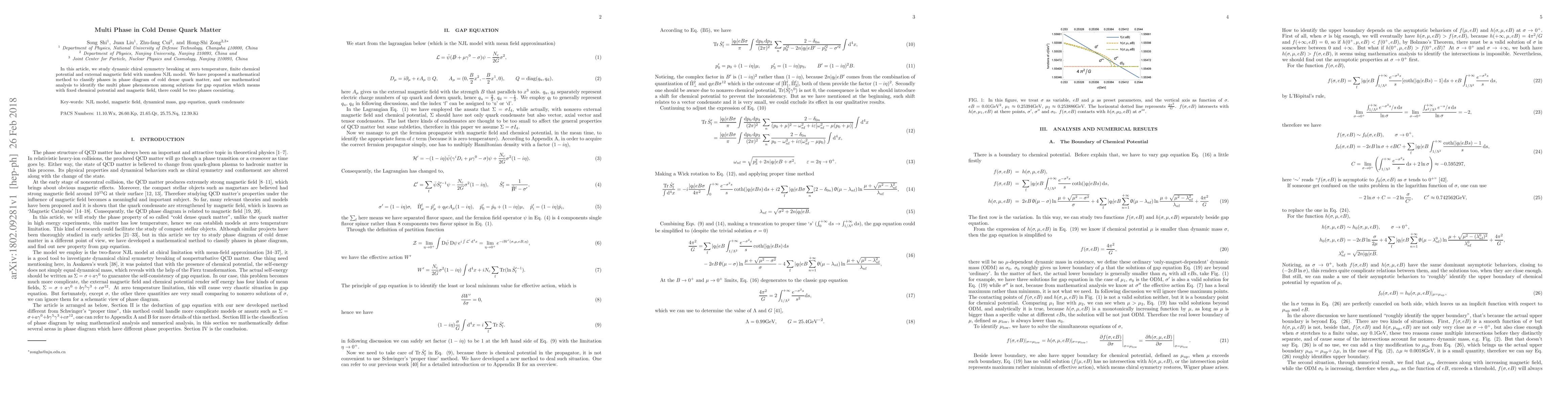 In this article, we study dynamic chiral symmetry breaking at zero temperature, finite chemical potential and external magnetic field with massless NJL model. We have proposed a mathematical method to classify phases in phase diagram of cold dense quark matter, and use mathematical analysis to identify the multi phase phenomenon among solutions for gap equation which means with fixed chemical potential and magnetic field, there could be two phases coexisting.