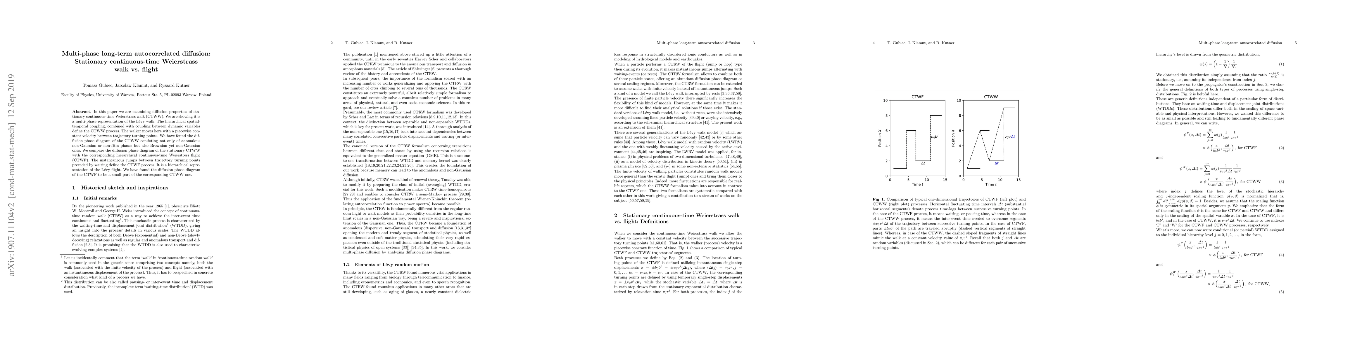 In this paper we are examining diffusion properties of stationary continuous-time Weierstrass walk (CTWW). We are showing it is a multi-phase representation of the L\'evy walk. The hierarchical spatial-temporal coupling, combined with coupling between dynamic variables define the CTWW process. The walker moves here with a piecewise constant velocity between trajectory turning points. We have found the diffusion phase diagram of the CTWW consisting not only of anomalous non-Gaussian or non-fBm phases but also Brownian yet non-Gaussian ones. We compare the diffusion phase diagram of the stationary CTWW with the corresponding hierarchical continuous-time Weierstress flight (CTWF). The instantaneous jumps between trajectory turning points preceded by waiting define the CTWF process. It is a hierarchical representation of the L\'evy flight. We have found the diffusion phase diagram of the CTWF to be a small part of the corresponding CTWW one.