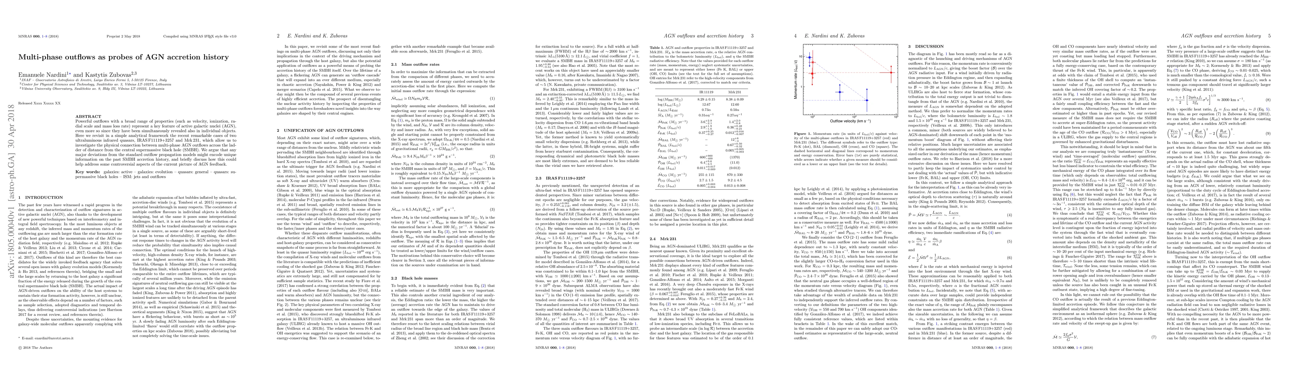 Powerful outflows with a broad range of properties (such as velocity, ionization, radial scale and mass loss rate) represent a key feature of active galactic nuclei (AGN), even more so since they have been simultaneously revealed also in individual objects. Here we revisit in a simple analytical framework the recent remarkable cases of two ultraluminous infrared quasars, IRAS F11119+3257 and Mrk 231, which allow us to investigate the physical connection between multi-phase AGN outflows across the ladder of distance from the central supermassive black hole (SMBH). We argue that any major deviations from the standard outflow propagation models might encode unique information on the past SMBH accretion history, and briefly discuss how this could help address some controversial aspects of the current picture of AGN feedback.