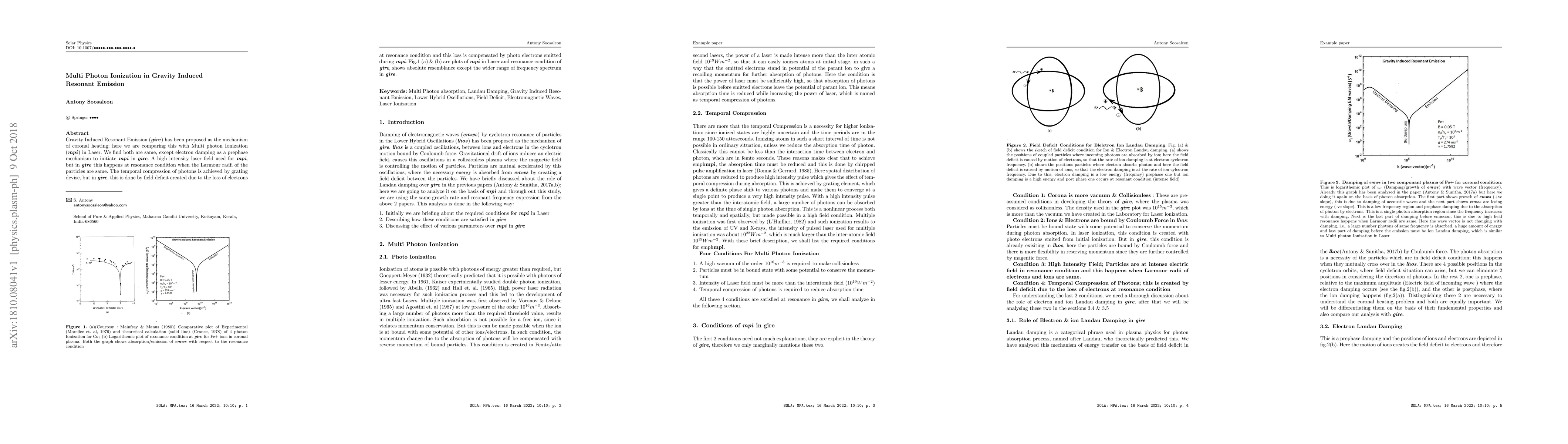 Gravity Induced Resonant Emission (gire) has been proposed as the mechanism of coronal heating; here we are comparing this with Multi photon Ionisation (mpi) in Laser. We find both are same, except electron damping as a pre-phase mechanism to initiate mpi in gire. A high intensity laser field used for mpi, but in gire, this happens at resonance condition when the Larmour radii of the particles are same. The temporal compression of photons is achieved by grating devise, but in gire, this is done by field deficit created due to the loss of electrons at resonance condition and this loss is compensated by photo electrons emitted during mpi. Fig.1 (a) \& (b) are plots of mpi in Laser and resonance condition of gire, shows absolute resemblance except the wider range of frequency spectrum in gire.