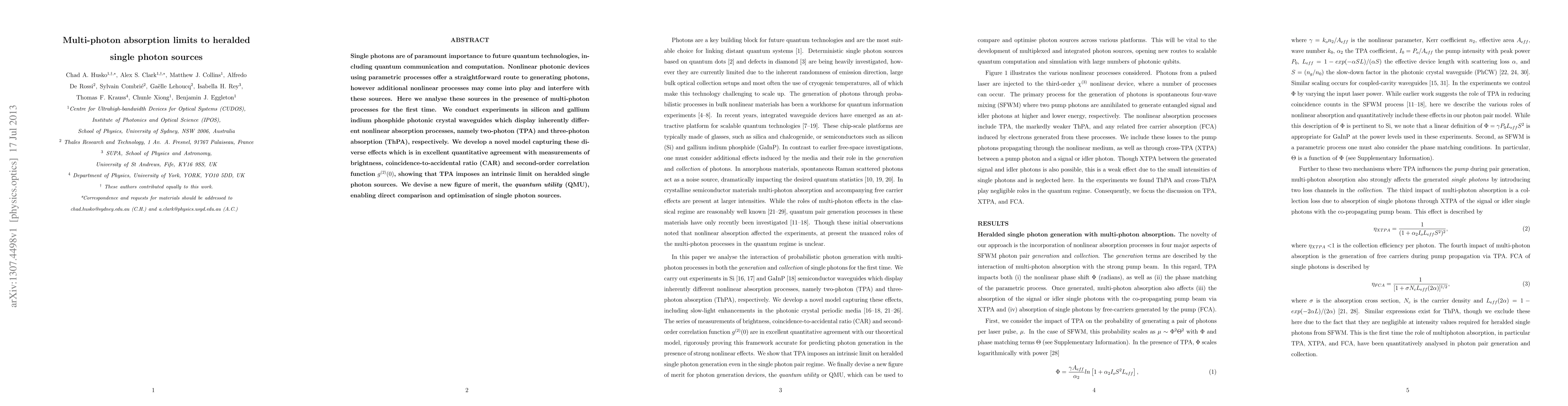 Single photons are of paramount importance to future quantum technologies, including quantum communication and computation. Nonlinear photonic devices using parametric processes offer a straightforward route to generating photons, however additional nonlinear processes may come into play and interfere with these sources. Here we analyse these sources in the presence of multi-photon processes for the first time. We conduct experiments in silicon and gallium indium phosphide photonic crystal waveguides which display inherently different nonlinear absorption processes, namely two-photon (TPA) and three-photon absorption (ThPA), respectively. We develop a novel model capturing these diverse effects which is in excellent quantitative agreement with measurements of brightness, coincidence-to-accidental ratio (CAR) and second-order correlation function g(2)(0), showing that TPA imposes an intrinsic limit on heralded single photon sources. We devise a new figure of merit, the quantum utility (QMU), enabling direct comparison and optimisation of single photon sources.