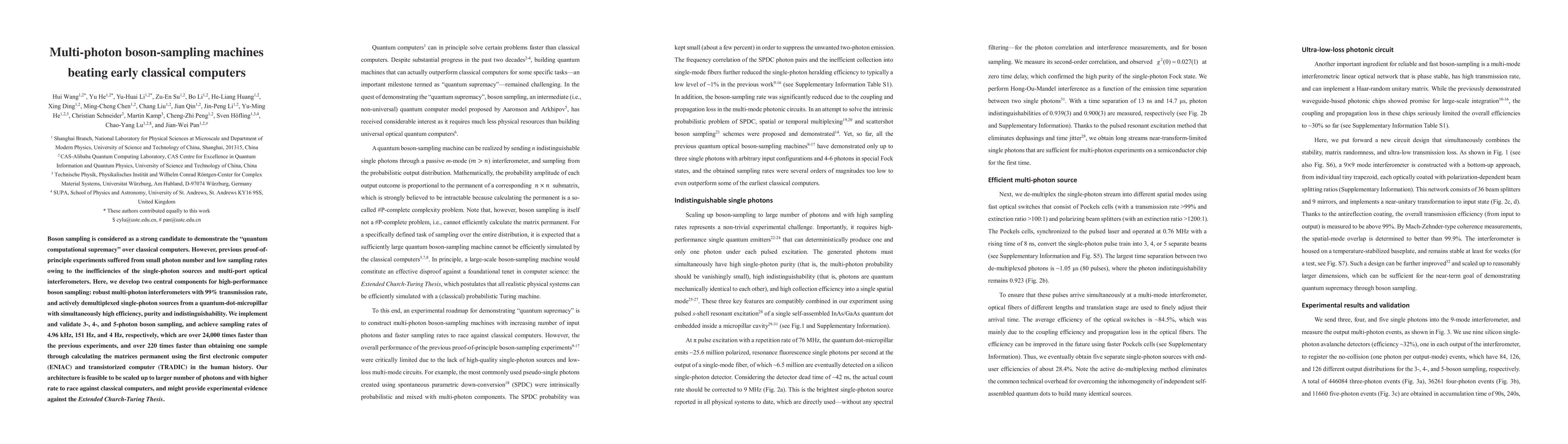 This paper develops high-performance boson sampling machines using advanced multi-photon interferometers and single-photon sources, achieving sampling rates 24,000 times faster than previous experiments and 220 times faster than early classical computers, suggesting potential quantum computational supremacy.