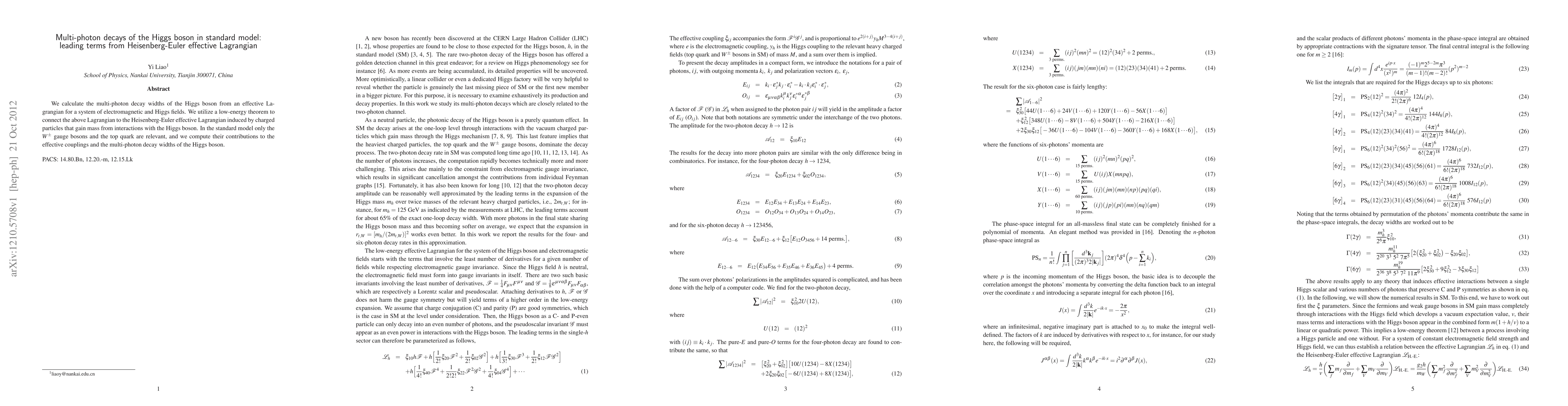 This paper calculates the multi-photon decay widths of the Higgs boson using the Heisenberg-Euler effective Lagrangian, focusing on contributions from W^\pm gauge bosons and the top quark in the Standard Model. The study employs a low-energy theorem to connect the effective Lagrangian to electromagnetic and Higgs fields.
