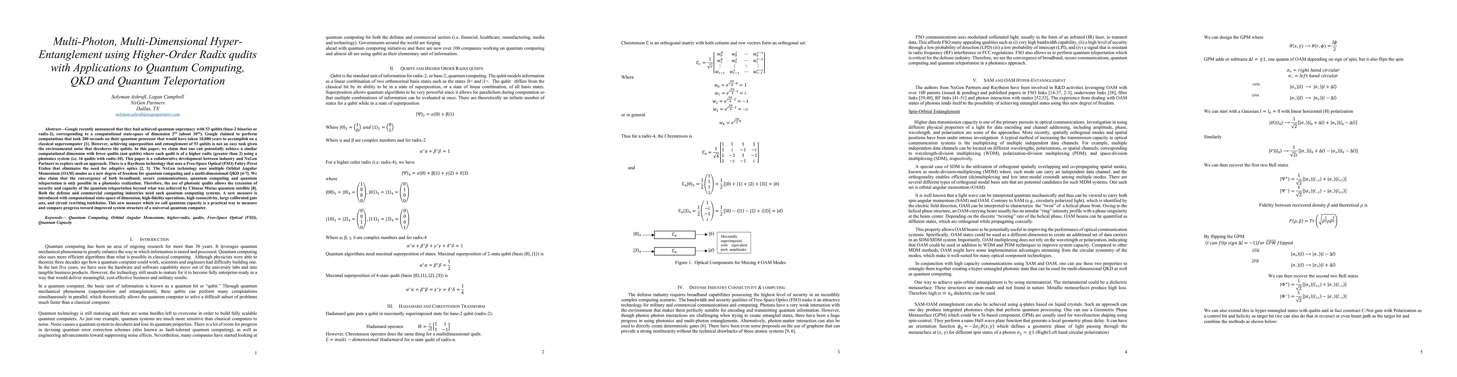 Google recently announced that they had achieved quantum supremacy with 53 qubits (base-2 binaries or radix-2), corresponding to a computational state-space of dimension 253 (about 1016). Google claimed to perform computations that took 200 seconds on their quantum processor that would have taken 10,000 years to accomplish on a classical supercomputer [1]. However, achieving superposition and entanglement of 53 qubits is not an easy task given the environmental noise that decoheres the qubits. In this paper, we claim that one can potentially achieve a similar computational dimension with fewer qudits (not qubits) where each qudit is of a higher radix (greater than 2) using a photonics system (i.e. 16 qudits with radix-10). This paper is a collaborative development between industry and NxGen Partners to explore such an approach. There is a Raytheon technology that uses a Free-Space Optical (FSO) Fabry-Perot Etalon that eliminates the need for adaptive optics [2, 3]. The NxGen technology uses multiple Orbital Angular Momentum (OAM) modes as a new degree of freedom for quantum computing and a multi-dimensional QKD [4-7]. We also claim that the convergence of both broadband, secure communications, quantum computing and quantum teleportation is only possible in a photonics realization. Therefore, the use of photonic qudits allows the extension of security and capacity of the quantum teleportation beyond what was achieved by Chinese Micius quantum satellite [8]. Both the defense and commercial computing industries need such quantum computing systems. A new measure is introduced with computational state-space dimension, high-fidelity operations, high connectivity, large calibrated gate sets, and circuit rewriting toolchains. This new measure which we call quantum capacity is a practical way to measure and compare progress toward improved system structure of a universal quantum computer.