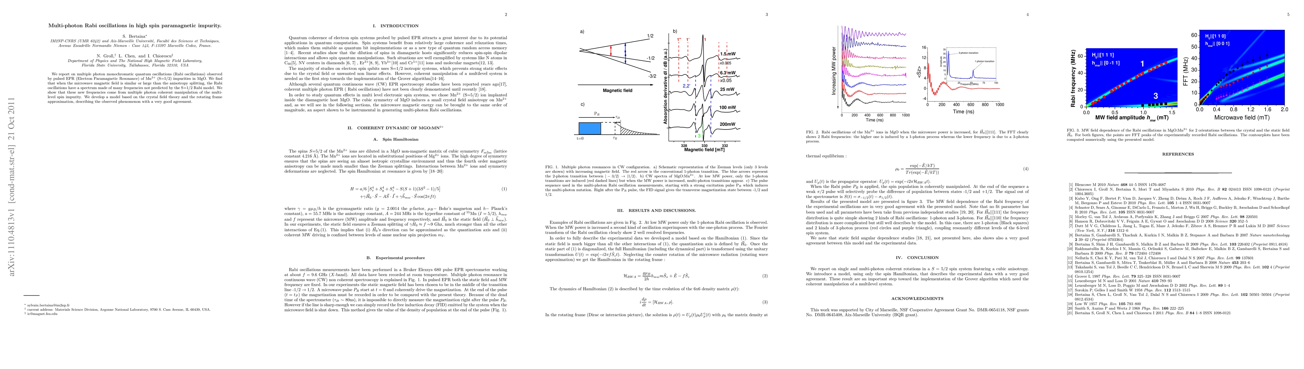 The study utilized pulsed Electron Paramagnetic Resonance (EPR) spectroscopy on Mn²⁺ (S=5/2) impurities in MgO to observe multi-photon Rabi oscillations. The research focused on the behavior of the high-spin impurity under varying microwave magnetic field strengths relative to the anisotropy splitting.