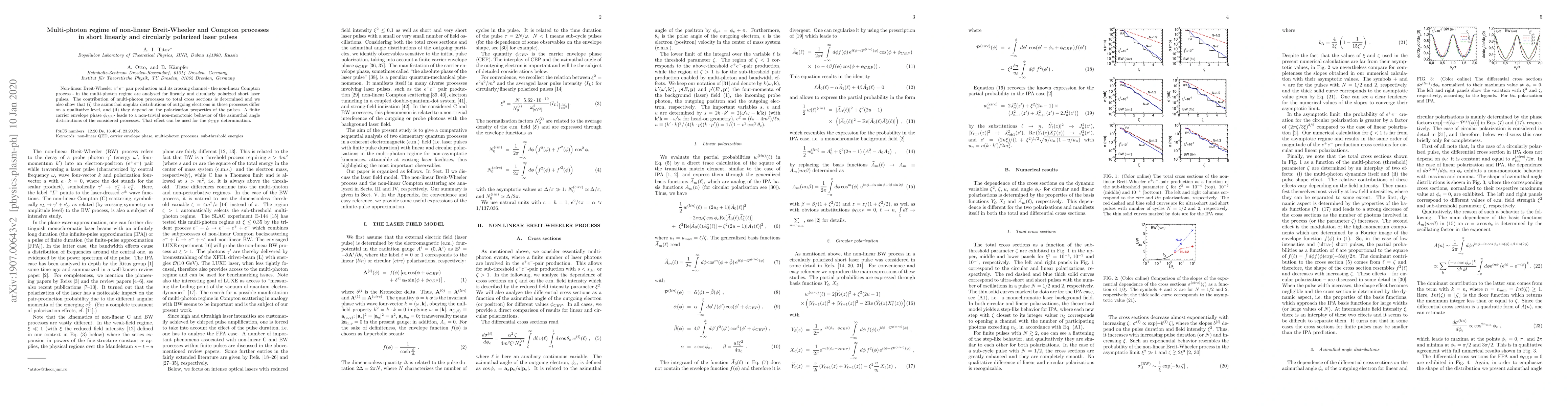 This paper investigates non-linear Breit-Wheeler and Compton processes in the multi-photon regime using short laser pulses with linear and circular polarization. It finds distinct azimuthal angular distributions for outgoing electrons, which depend on pulse polarization and carrier envelope phase, potentially enabling CEP determination.