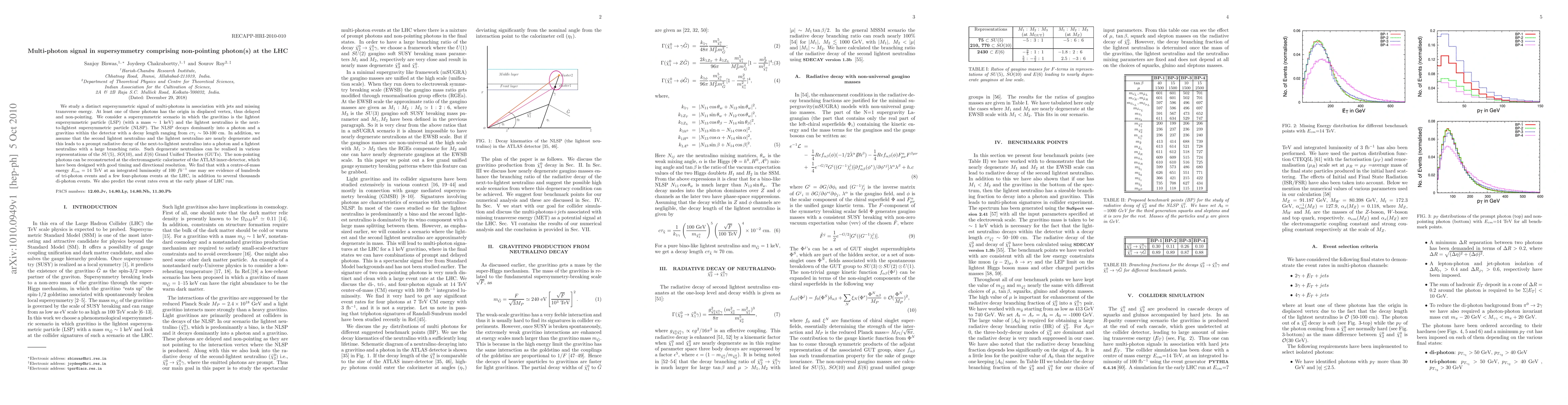 We study a distinct supersymmetric signal of multi-photons in association with jets and missing transverse energy. At least one of these photons has the origin in displaced vertex, thus delayed and non-pointing. We consider a supersymmetric scenario in which the gravitino is the lightest supersymmetric particle (LSP) (with a mass $\sim 1~{keV}$) and the lightest neutralino is the next-to-lightest supersymmetric particle (NLSP). The NLSP decays dominantly into a photon and a gravitino within the detector with a decay length ranging from $c\tau_{\tilde{\chi}}\sim$ 50-100 cm. In addition, we assume that the second lightest neutralino and the lightest neutralino are nearly degenerate and this leads to a prompt radiative decay of the next-to-lightest neutralino into a photon and a lightest neutralino with a large branching ratio. Such degenerate neutralinos can be realised in various representations of the $SU(5)$, $SO(10)$, and $E(6)$ Grand Unified Theories (GUTs). The non-pointing photons can be reconstructed at the electromagnetic calorimeter of the ATLAS inner-detector, which have been designed with good timing and directional resolution. We find that with a centre-of-mass energy $E_{cm}=14 ~{TeV}$ at an integrated luminosity of 100 $fb^{-1}$ one may see evidence of hundreds of tri-photon events and a few four-photons events at the LHC, in addition to several thousands di-photon events. We also predict the event rates even at the early phase of LHC run.