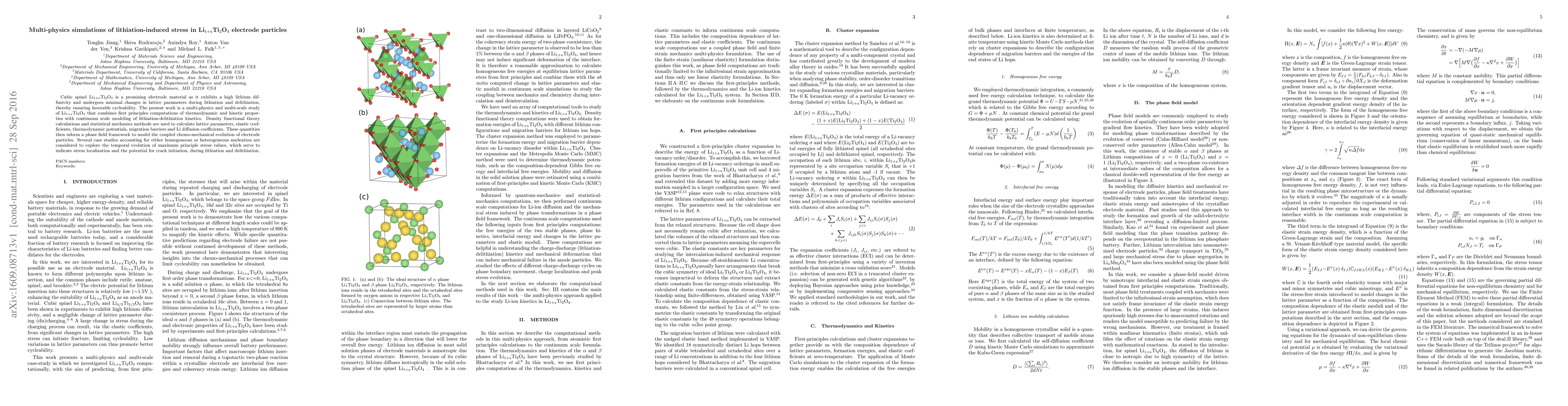 This paper combines first principles computations and continuum modeling to study lithiation-induced stress in Li$_{1+x}$Ti$_2$O$_4$ electrode particles, revealing stress localization and potential for crack initiation during cycling through multi-physics simulations. The research uses density functional theory and statistical mechanics to inform a phase field model of chemo-mechanical evolution.