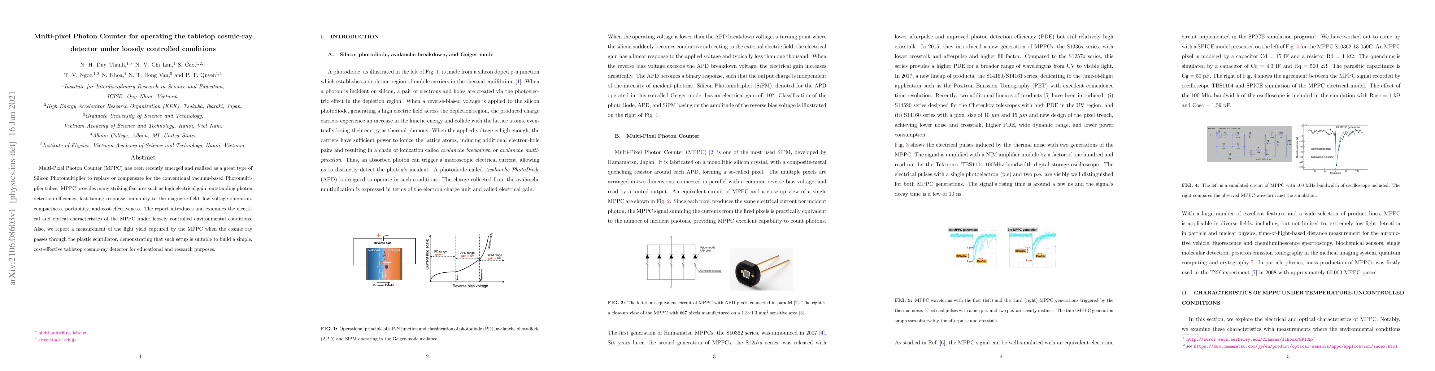 Multi-Pixel Photon Counter (MPPC) has been recently emerged and realized as a great type of Silicon Photomultiplier to replace or compensate for the conventional vacuum-based Photomultiplier tubes. MPPC provides many striking features such as high electrical gain, outstanding photon detection efficiency, fast timing response, immunity to the magnetic field, low-voltage operation, compactness, portability, and cost-effectiveness. The report introduces and examines the electrical and optical characteristics of the MPPC under loosely controlled environmental conditions. Also, we report a measurement of the light yield captured by the MPPC when the cosmic ray passes through the plastic scintillator, demonstrating that such setup is suitable to build a simple, cost-effective tabletop cosmic-ray detector for educational and research purposes.