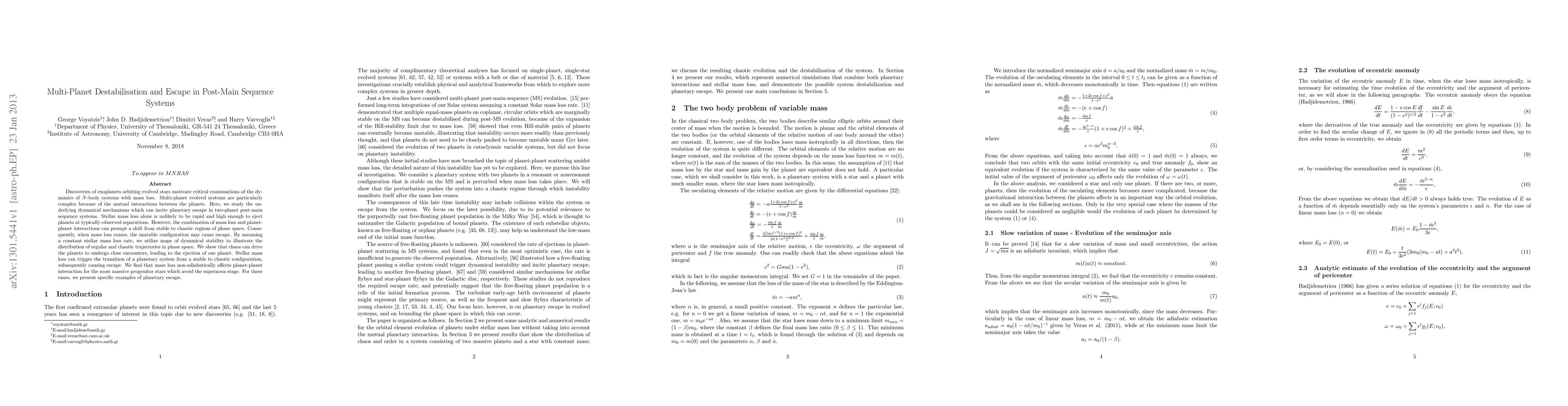 This paper investigates the dynamics of two-planet systems in post-main sequence stars, revealing how stellar mass loss combined with planet-planet interactions can lead to chaotic trajectories and planetary escape. It demonstrates that while stellar mass loss alone is insufficient for ejection, it can trigger transitions to chaotic regions, ultimately causing one planet to escape.