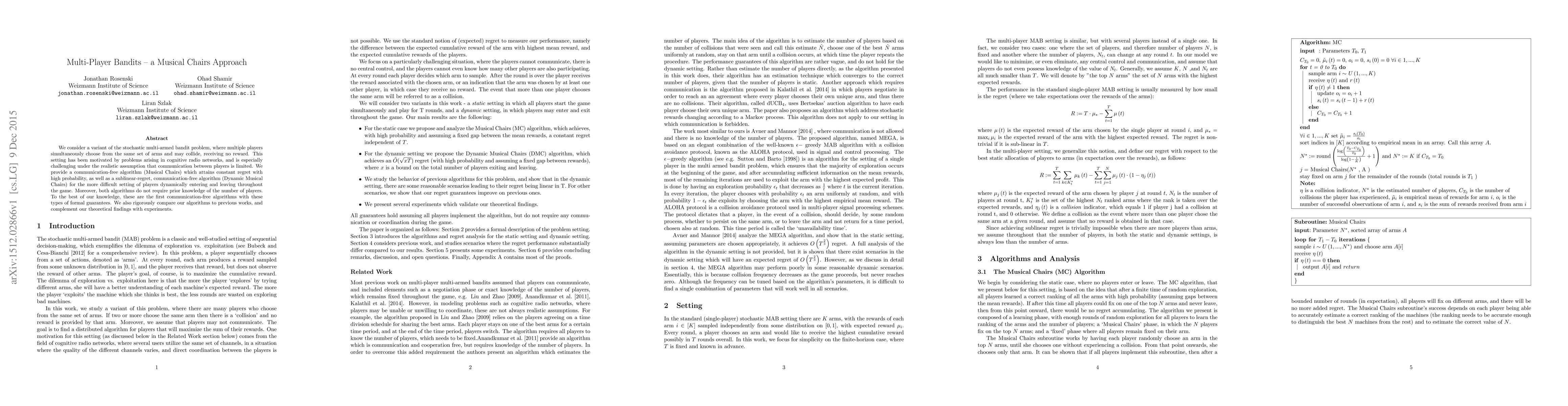 We consider a variant of the stochastic multi-armed bandit problem, where multiple players simultaneously choose from the same set of arms and may collide, receiving no reward. This setting has been motivated by problems arising in cognitive radio networks, and is especially challenging under the realistic assumption that communication between players is limited. We provide a communication-free algorithm (Musical Chairs) which attains constant regret with high probability, as well as a sublinear-regret, communication-free algorithm (Dynamic Musical Chairs) for the more difficult setting of players dynamically entering and leaving throughout the game. Moreover, both algorithms do not require prior knowledge of the number of players. To the best of our knowledge, these are the first communication-free algorithms with these types of formal guarantees. We also rigorously compare our algorithms to previous works, and complement our theoretical findings with experiments.