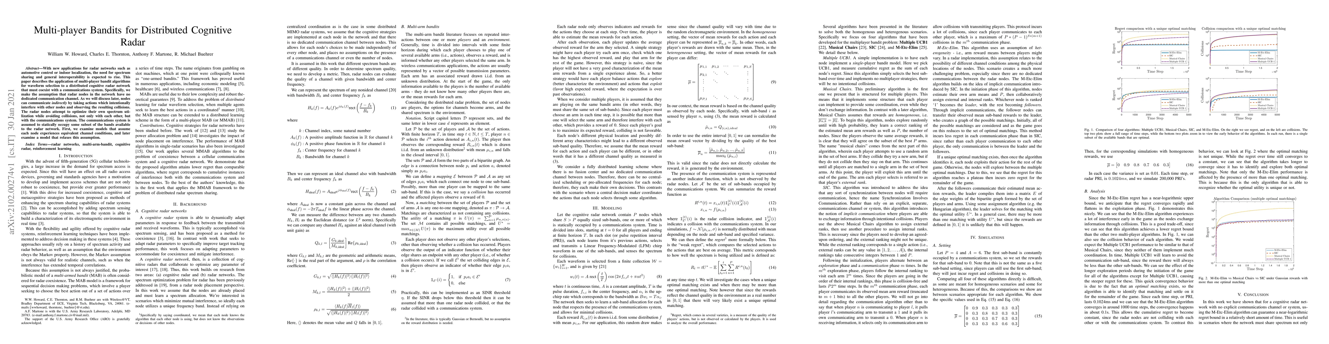 With new applications for radar networks such as automotive control or indoor localization, the need for spectrum sharing and general interoperability is expected to rise. This paper describes the application of multi-player bandit algorithms for waveform selection to a distributed cognitive radar network that must coexist with a communications system. Specifically, we make the assumption that radar nodes in the network have no dedicated communication channel. As we will discuss later, nodes can communicate indirectly by taking actions which intentionally interfere with other nodes and observing the resulting collisions. The radar nodes attempt to optimize their own spectrum utilization while avoiding collisions, not only with each other, but with the communications system. The communications system is assumed to statically occupy some subset of the bands available to the radar network. First, we examine models that assume each node experiences equivalent channel conditions, and later examine a model that relaxes this assumption.