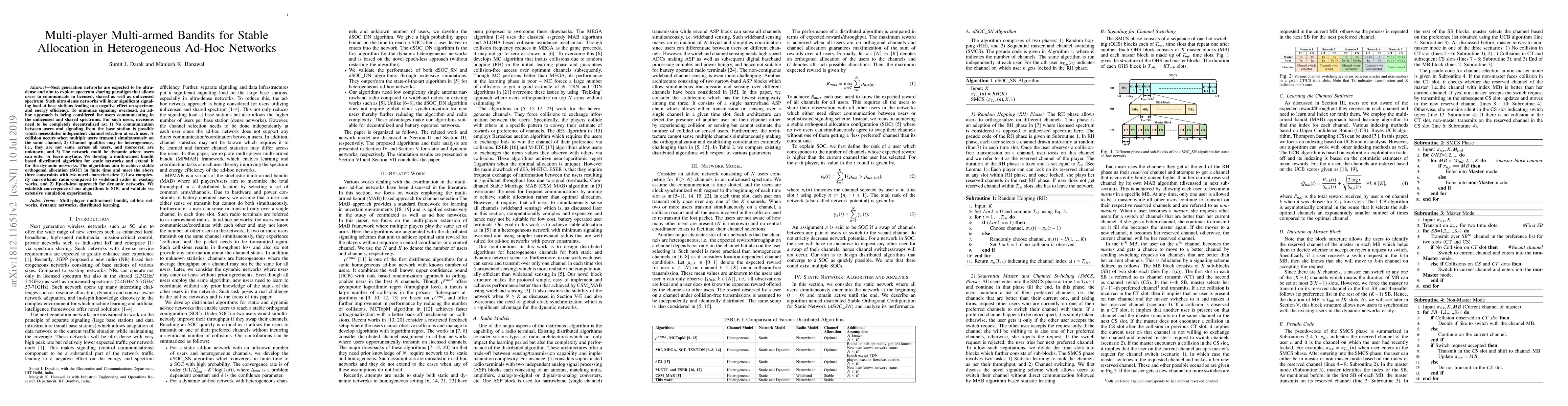This paper proposes a multi-player multi-armed bandit algorithm for decentralized channel allocation in ultra-dense, heterogeneous ad-hoc networks to minimize signaling overhead. The algorithm achieves stable orthogonal allocation in finite time with low complexity and an epoch-less approach for dynamic networks.