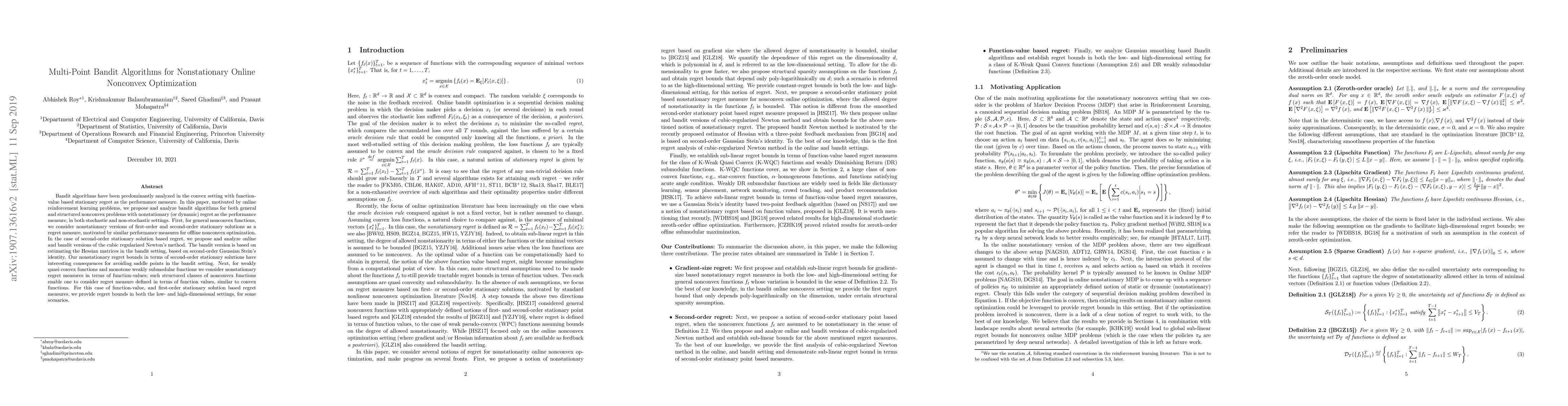 This paper proposes and analyzes bandit algorithms for nonconvex optimization problems in nonstationary settings, introducing nonstationary regret measures. It develops methods for general nonconvex functions and structured classes like weakly quasi-convex and monotone weakly submodular functions, providing regret bounds for both low- and high-dimensional scenarios.