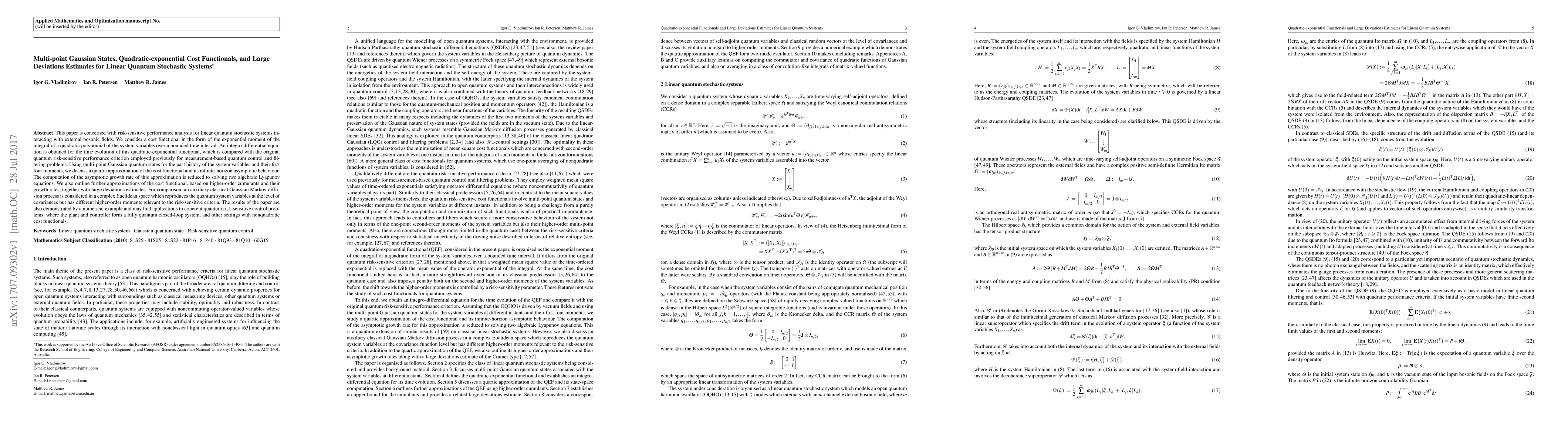 This paper analyzes risk-sensitive performance for linear quantum stochastic systems using quadratic-exponential cost functionals and multi-point Gaussian states. It derives an integro-differential equation for the cost functional and computes its asymptotic growth rate via algebraic Lyapunov equations, providing large deviations estimates and potential applications to quantum risk-sensitive control.