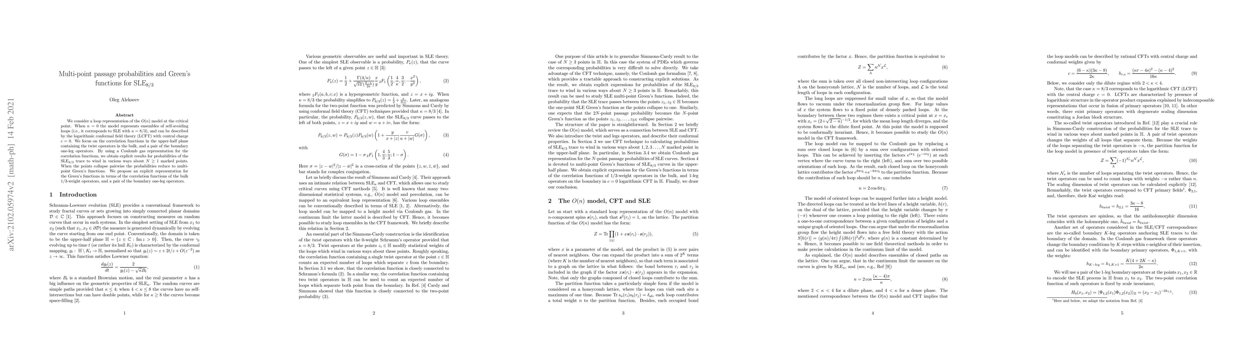 We consider a loop representation of the $O(n)$ model at the critical point. When $n=0$ the model represents ensembles of self-avoiding loops (i.e., it corresponds to SLE with $\kappa=8/3$), and can be described by the logarithmic conformal field theory (LCFT) with central charge $c=0$. We focus on the correlation functions in the upper-half plane containing the twist operators in the bulk, and a pair of the boundary one-leg operators. By using a Coulomb gas representation for the correlation functions, we obtain explicit results for probabilities of the SLE${}_{8/3}$ trace to wind in various ways about $N\geq 1$ marked points. When the points collapse pairwise the probabilities reduce to multi-point Green's functions. We propose an explicit representation for the Green's functions in terms of the correlation functions of the bulk 1/3-weight operators, and a pair of the boundary one-leg operators.