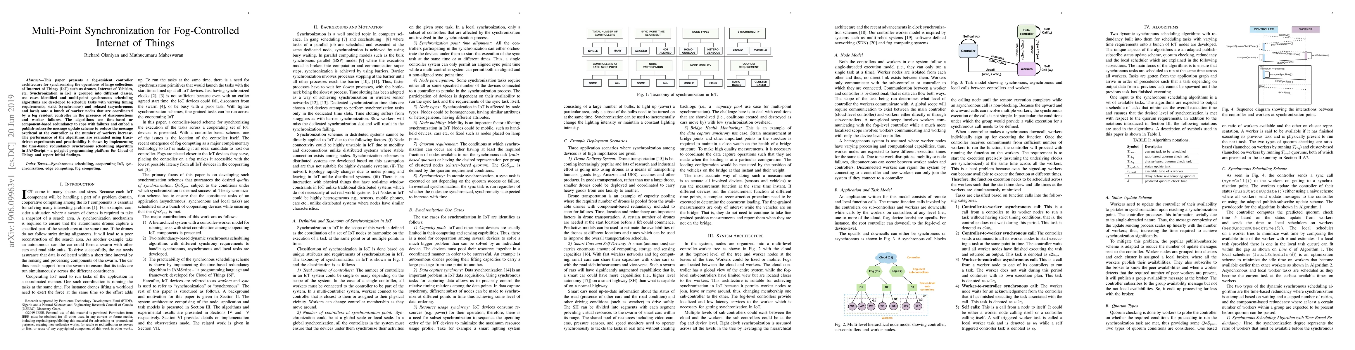 This paper presents a fog-resident controller architecture for synchronizing the operations of large collections of Internet of Things (IoT) such as drones, Internet of Vehicles, etc. Synchronization in IoT is grouped into different classes, use cases identified and multi-point synchronous scheduling algorithms are developed to schedule tasks with varying timing requirements; strict (synchronous) and relaxed (asynchronous and local) onto a bunch of worker nodes that are coordinated by a fog resident controller in the presence of disconnections and worker failures. The algorithms use time-based or component-based redundancy to cope with failures and embed a publish-subscribe message update scheme to reduce the message overhead at the controller as the number of workers increase. The performance of the algorithms are evaluated using trace-driven experiments and practicability is shown by implementing the time-based redundancy synchronous scheduling algorithm in JAMScript -- a polyglot programming platform for Cloud of Things and report initial findings.