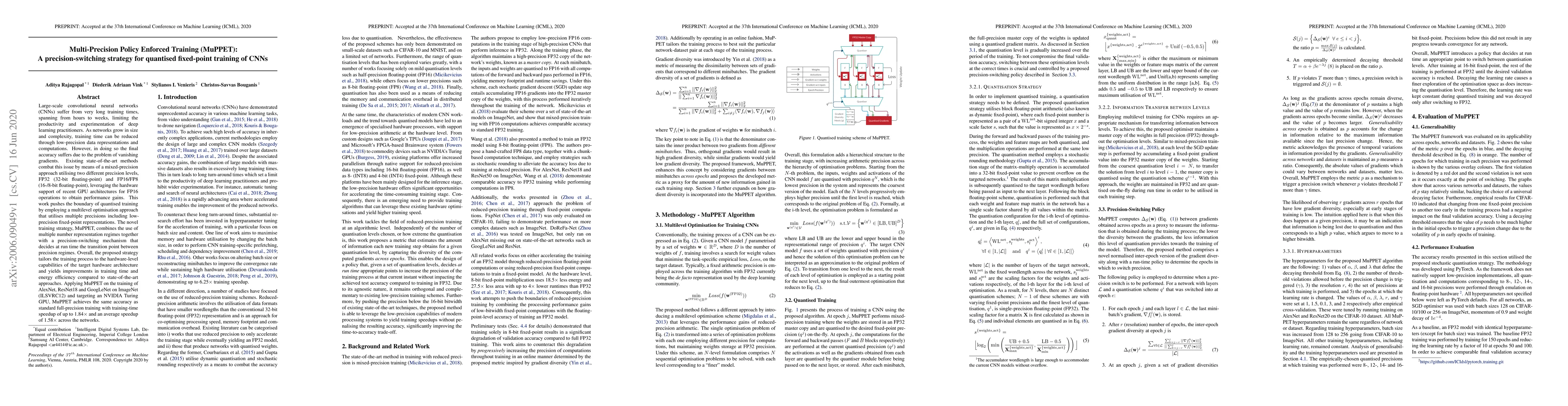 MuPPET introduces a multi-precision training strategy to accelerate CNN training by dynamically switching between different precision levels, achieving similar accuracy to full-precision training while reducing training time and energy consumption. This approach leverages multiple fixed-point representations and optimizes for hardware capabilities, resulting in up to 1.84x speedup.