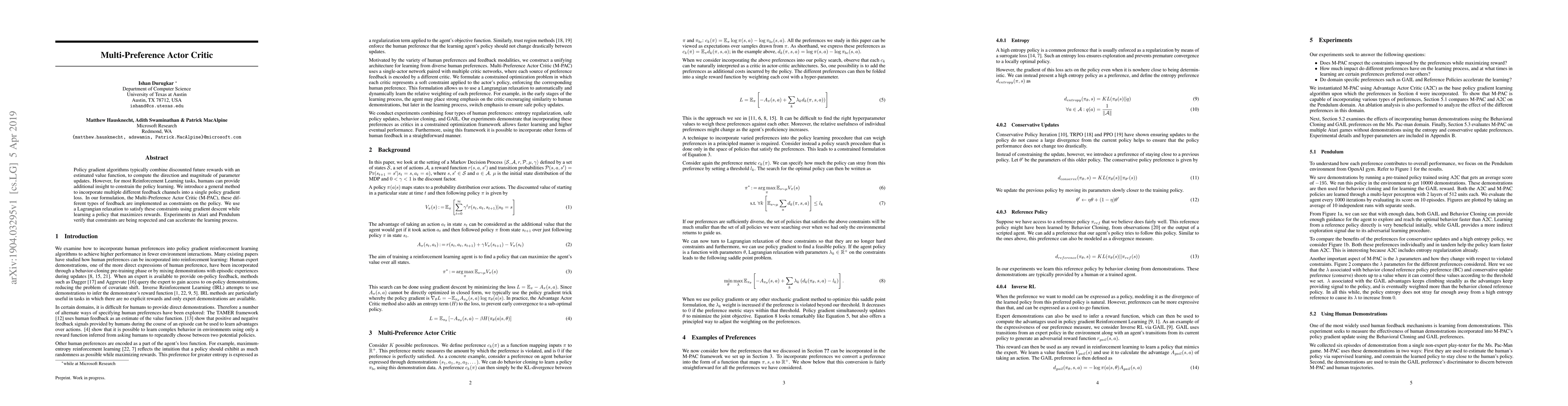Researchers introduced the Multi-Preference Actor Critic (M-PAC), a method to combine multiple types of feedback into a single policy gradient loss. This approach can accelerate learning in reinforcement learning tasks by incorporating human-provided constraints.