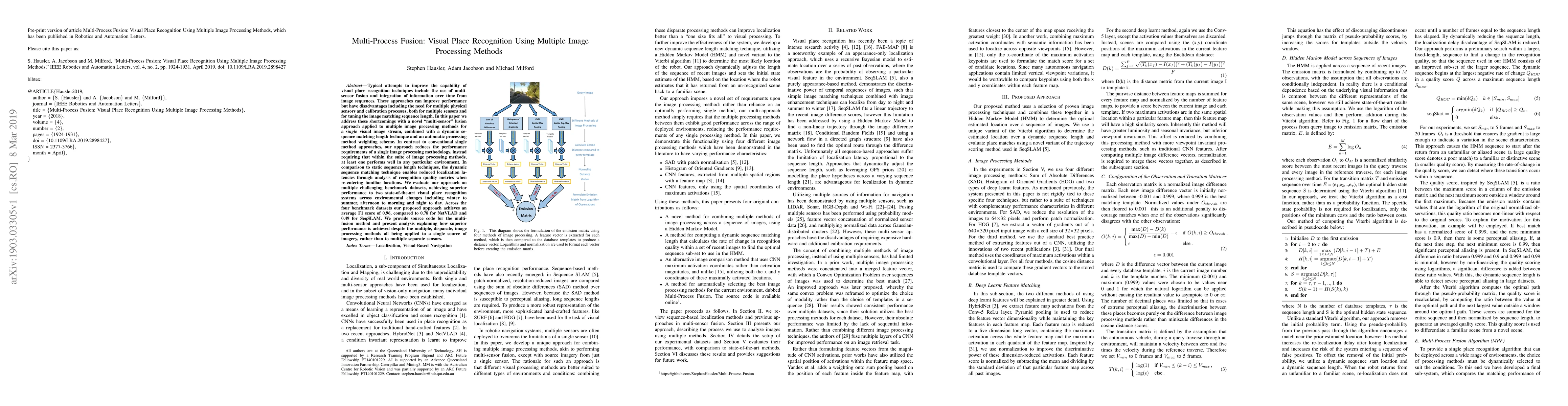 This paper proposes a novel "multi-sensor" fusion approach that combines multiple image processing methods for a single visual image stream, achieving superior visual place recognition performance across various environmental changes. The dynamic sequence matching length and automatic processing method weighting scheme reduce localization latencies and performance requirements, outperforming state-of-the-art systems with an average F1 score of 0.96.